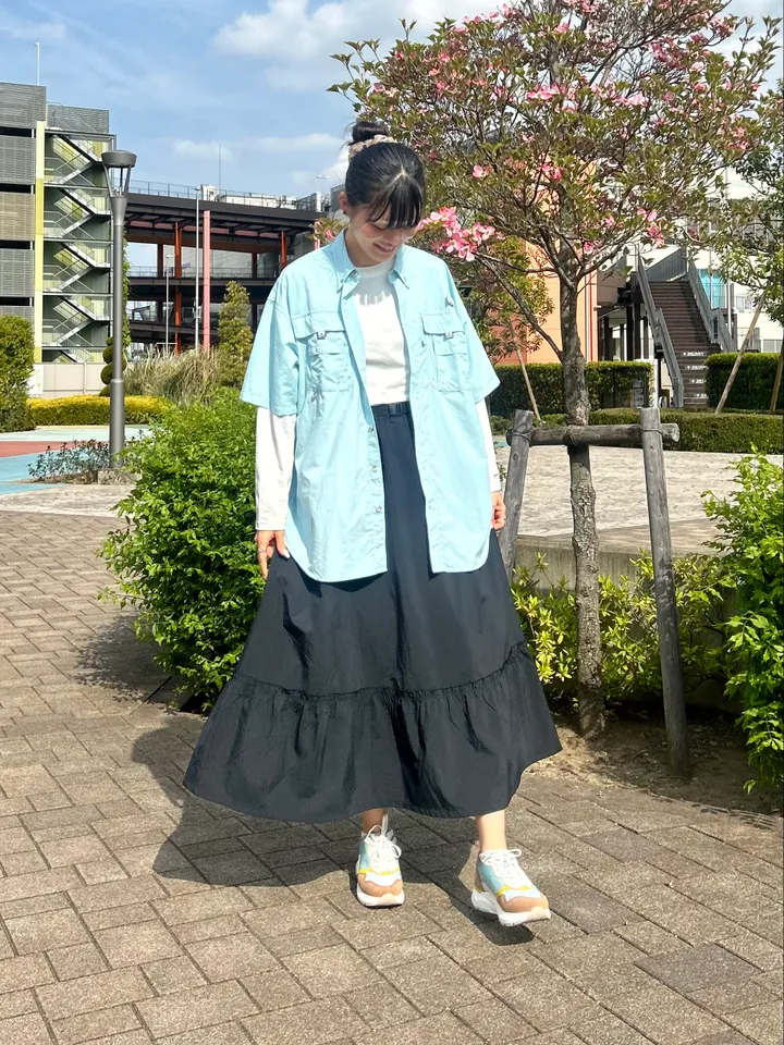 コロンビアといえばのバハマシャツとカジュアルでフェミニンなティアードスカートで晴天の爽やかピクニックコーデを組んでみました!2つとも紫外線防止機能がついているので日差しの心配も無用です!黒だと一気に暗いイメージになりがちですが、春色カラーを加えることで一気に明るい印象になります!まだ少し遊び足りない方には、イーストサイドオムニテックでちょっとしたアクセントを付けてみるともっと爽やかに大変身です。