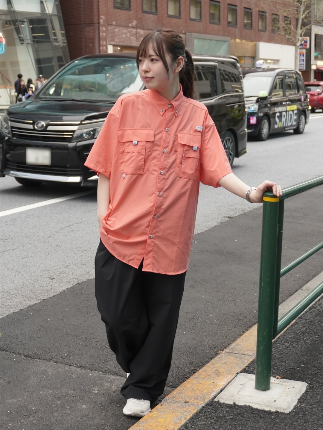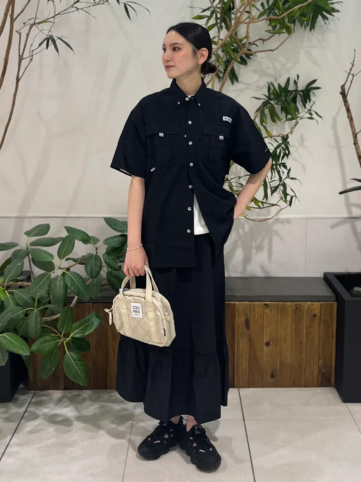 毎年定番の“バハマシャツ”を使ったコーディネートを組みました。こちらのバハマシャツは元々ビッグシルエットで、女性が大きめに着ると、とても可愛いと思います!今回はトップス、スカート、シューズを黒で統一し、靴下やバッグなどで全体のコーディネートにアクセントをつけてみました。