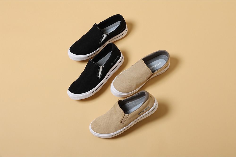脱ぎ履きしやすいスリップタイプで、キャンバス風のポリエステル素材を採用。 どんなファッションにも馴染むブラックとベージュの2色カラー。一部店舗およびオンラインストア限定モデル。
