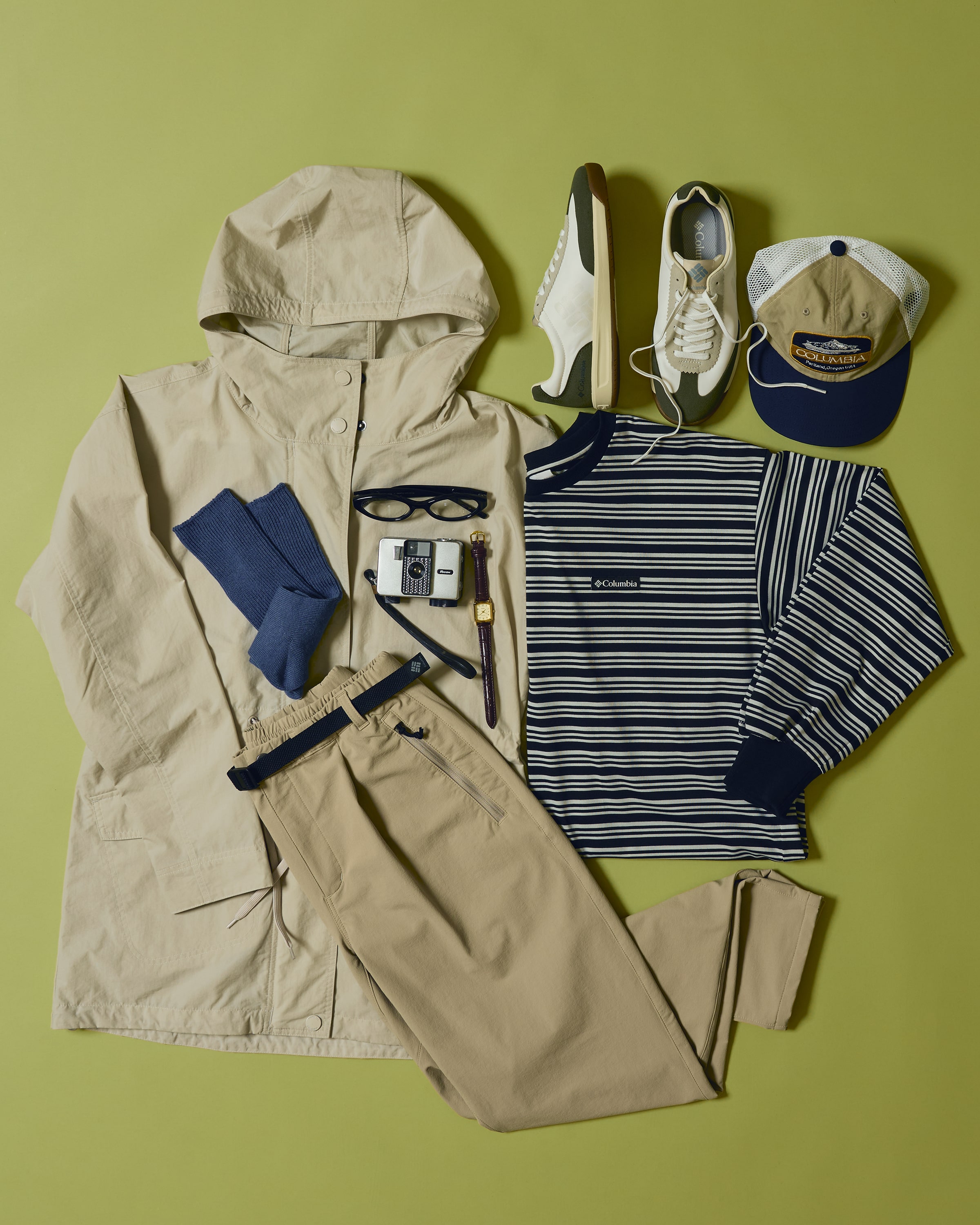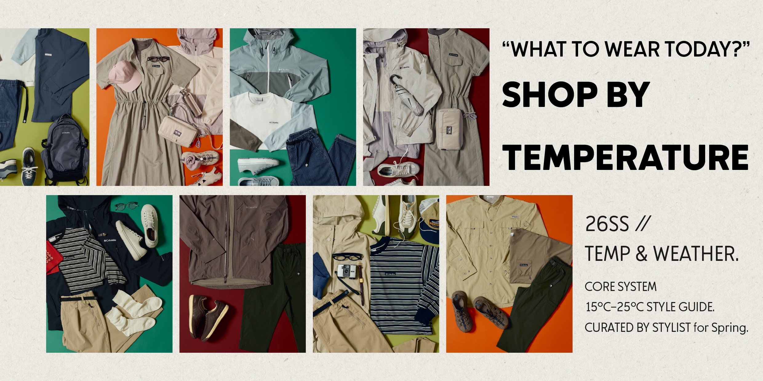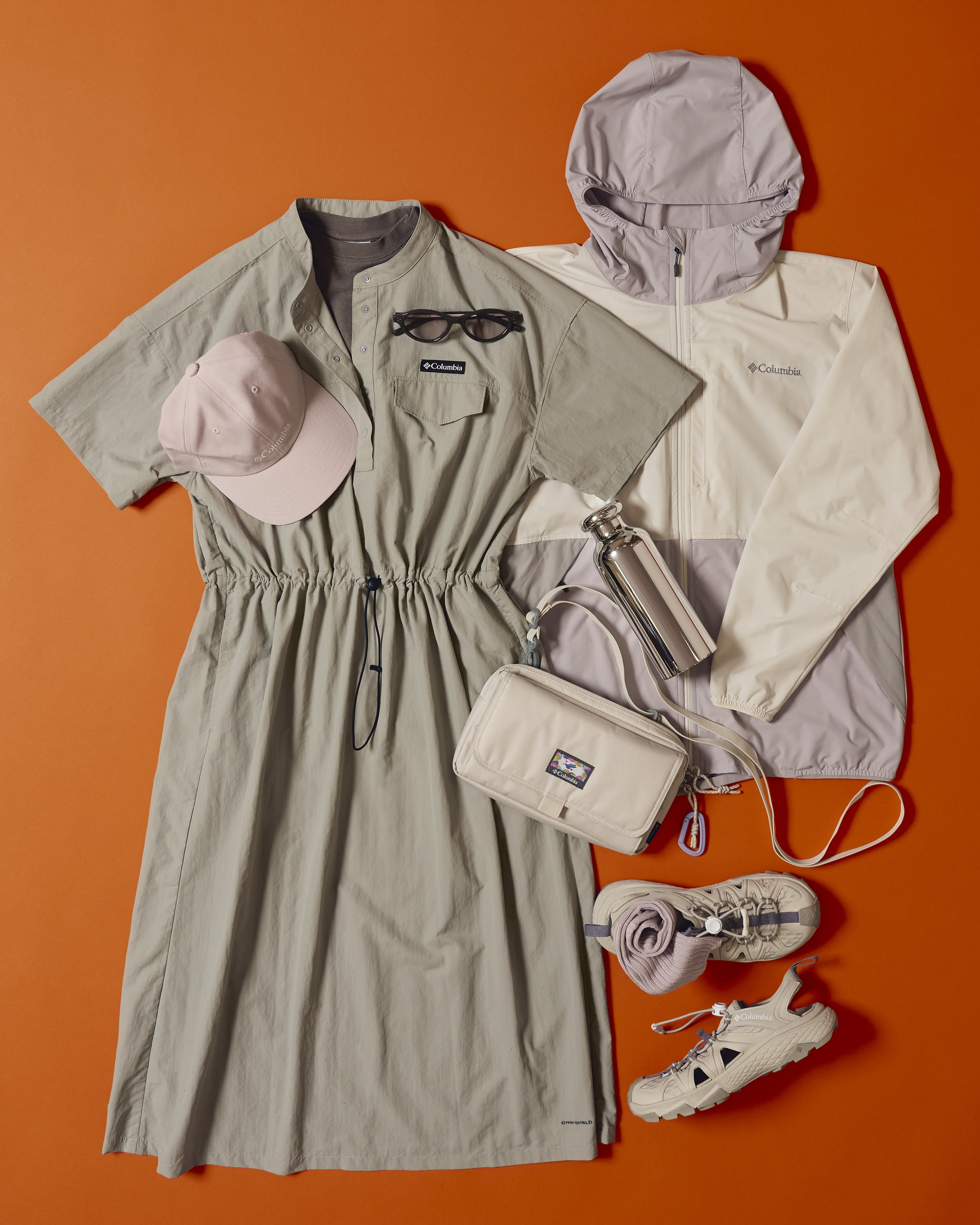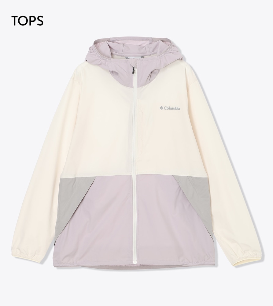 コロンビアで魅せる、意外なガーリースタイル。ラベンダー×桜色をベースとしたアウターや重ね着のシャツで、春の訪れを優しく表現。20〜25℃の柔らかな日差しに映える、フェミニンカジュアル。