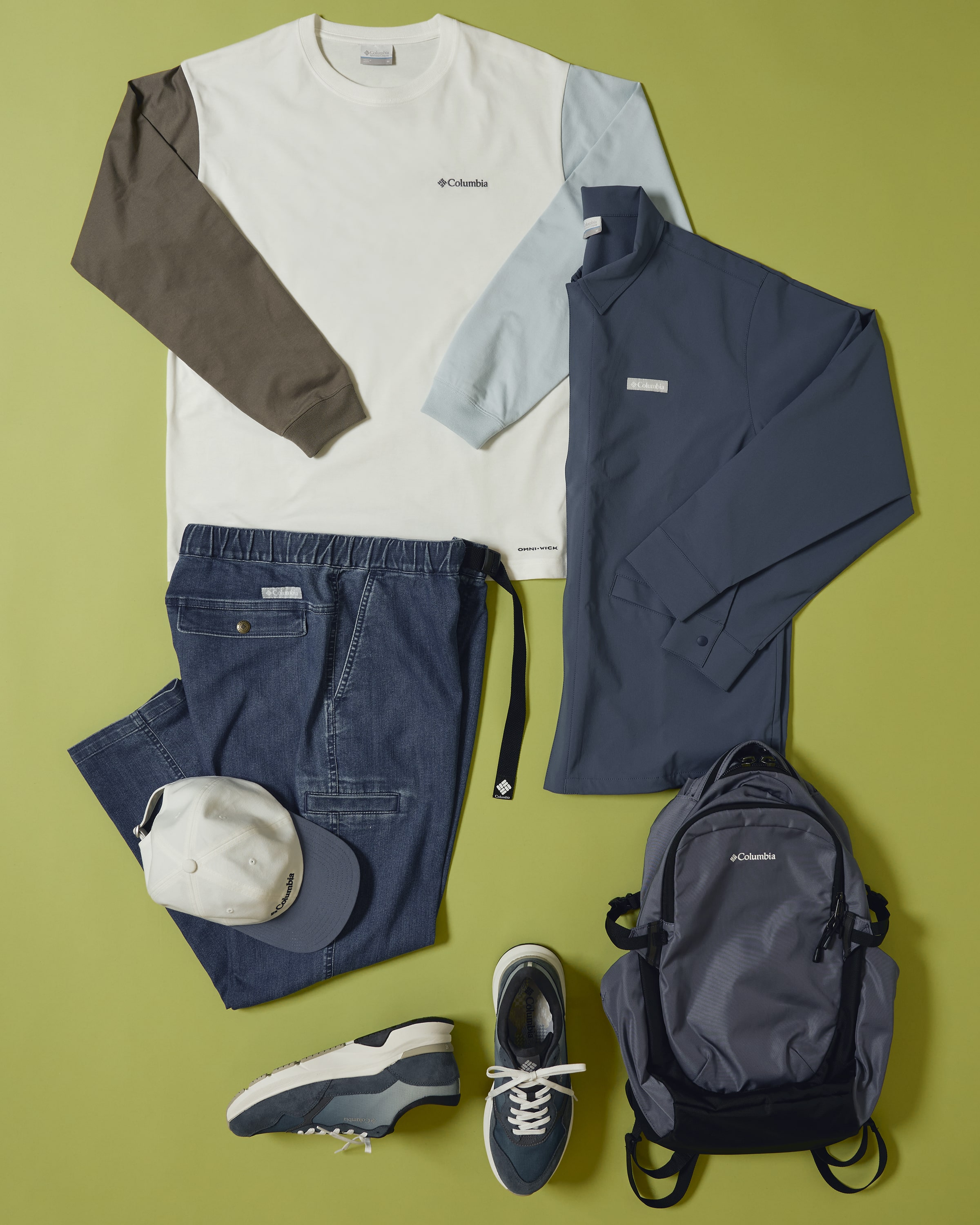 シャツジャケット、デニムパンツ、バックパックとネイビー基調の都会的なスタイル。Tシャツ、キャップ、スニーカーのホワイトカラーが抜け感をプラス。⼼地よい陽気に映える配⾊が、こなれたシティボーイな印象に。通気性に優れたシューズで、晴れの⽇も快適に過ごしやすい。