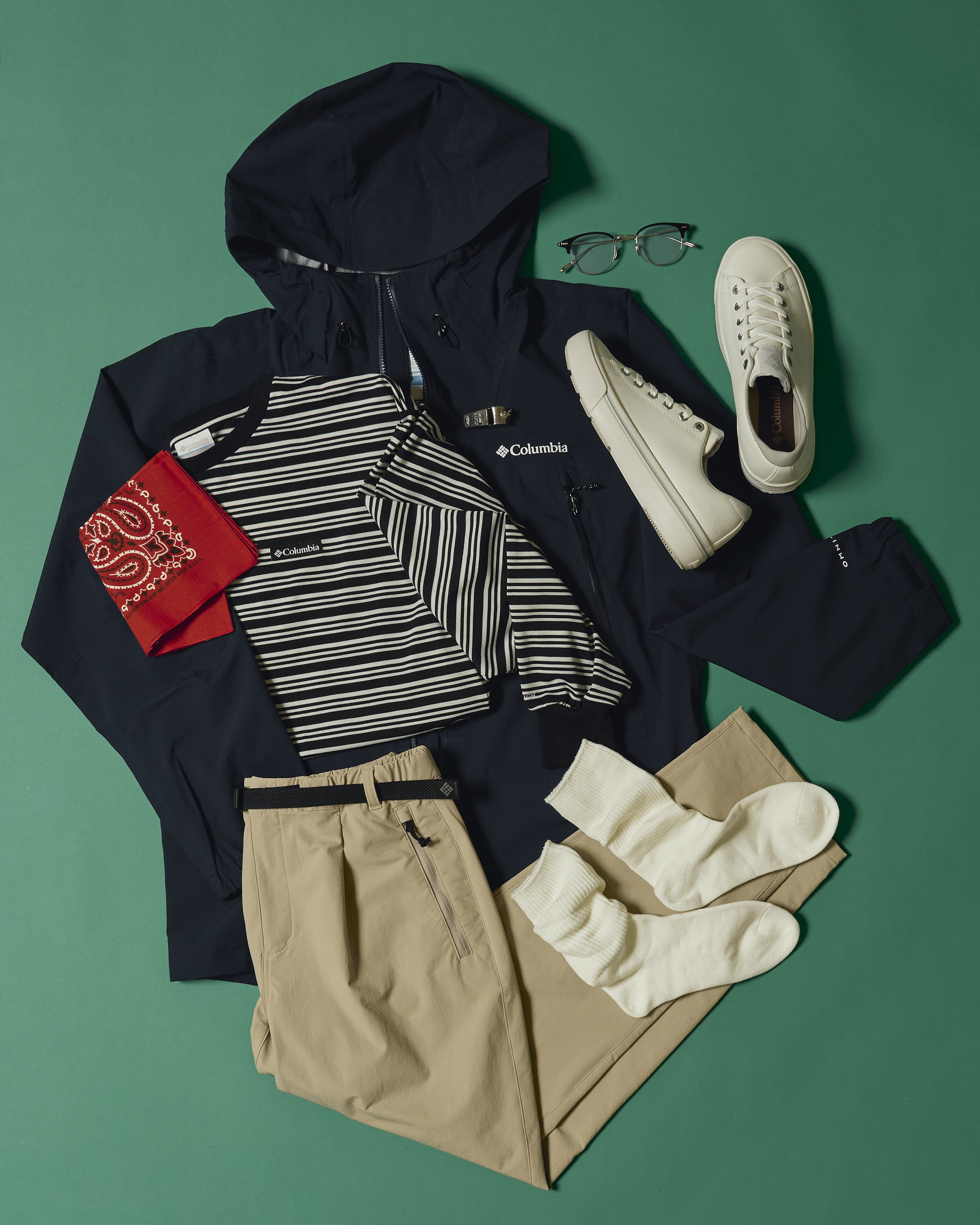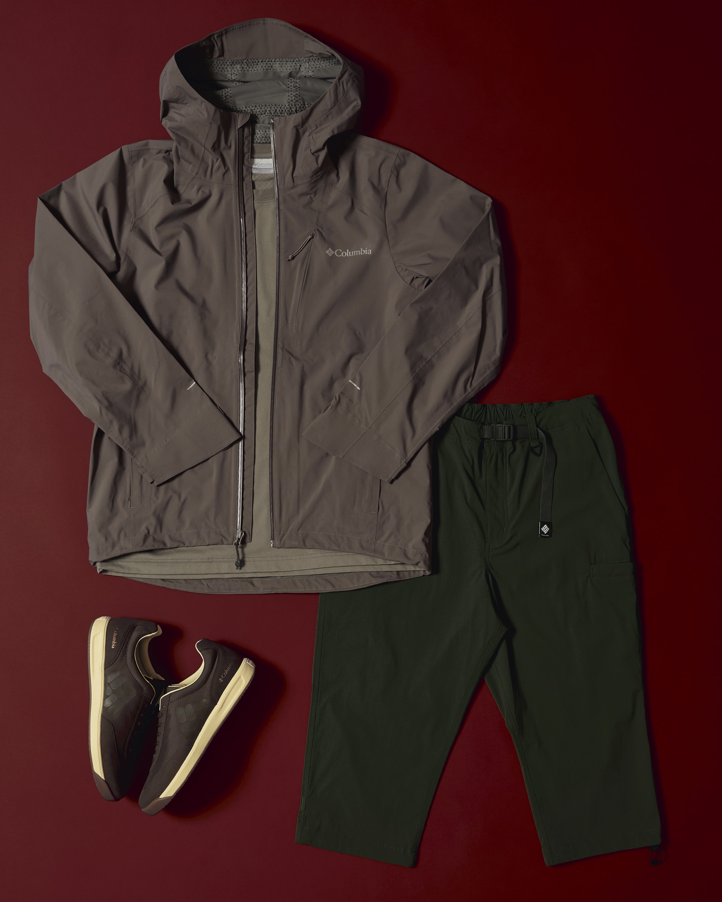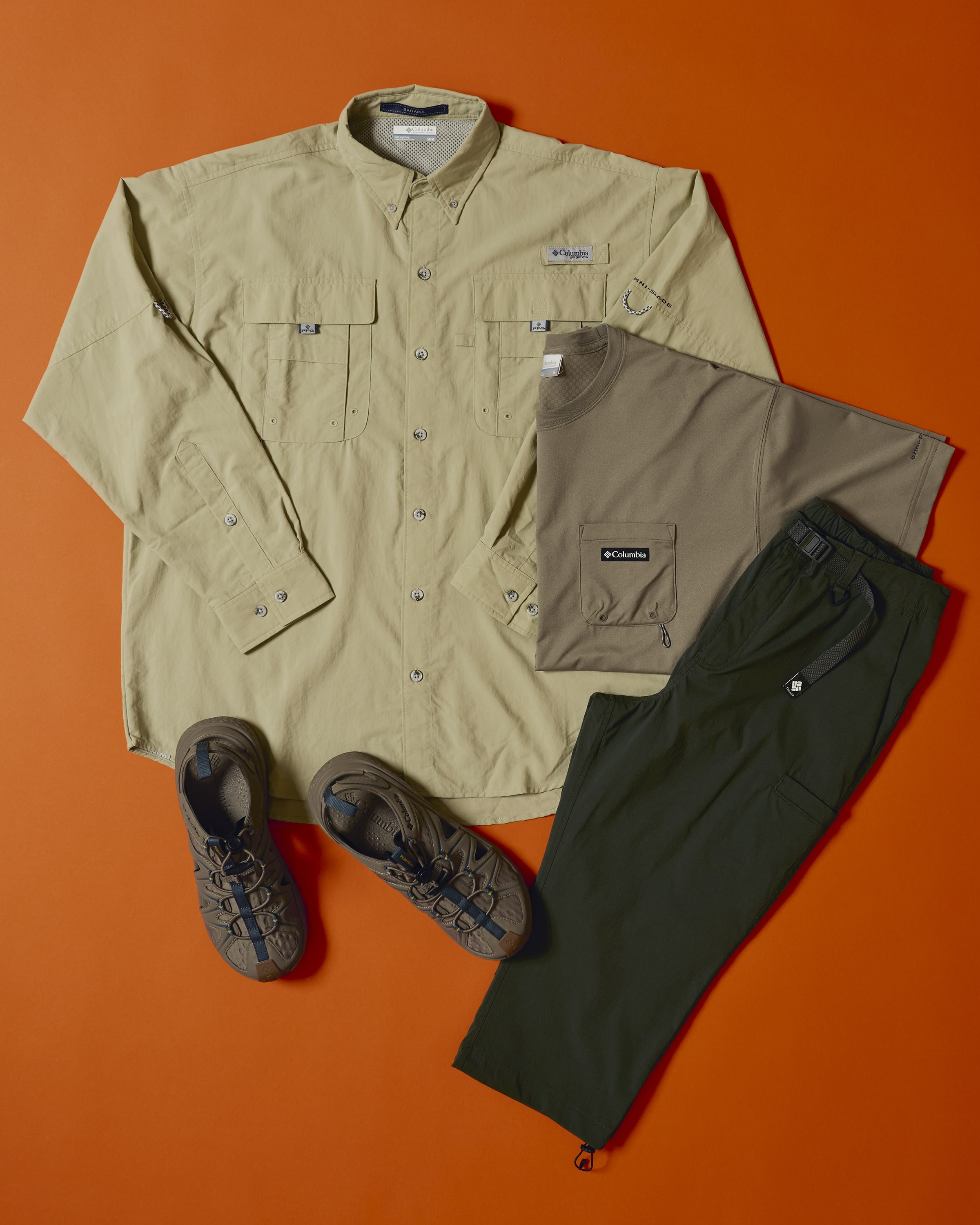 落ち着いたブラウンとカーキでまとめた、大人の雨の日スタイル。冷却機能「オムニフリーズゼロ」と速乾機能付きTシャツを仕込めば、アウター着用時もサラリと快適に。気まぐれな天気も、こなれた洒落感と軽やかさで攻略。