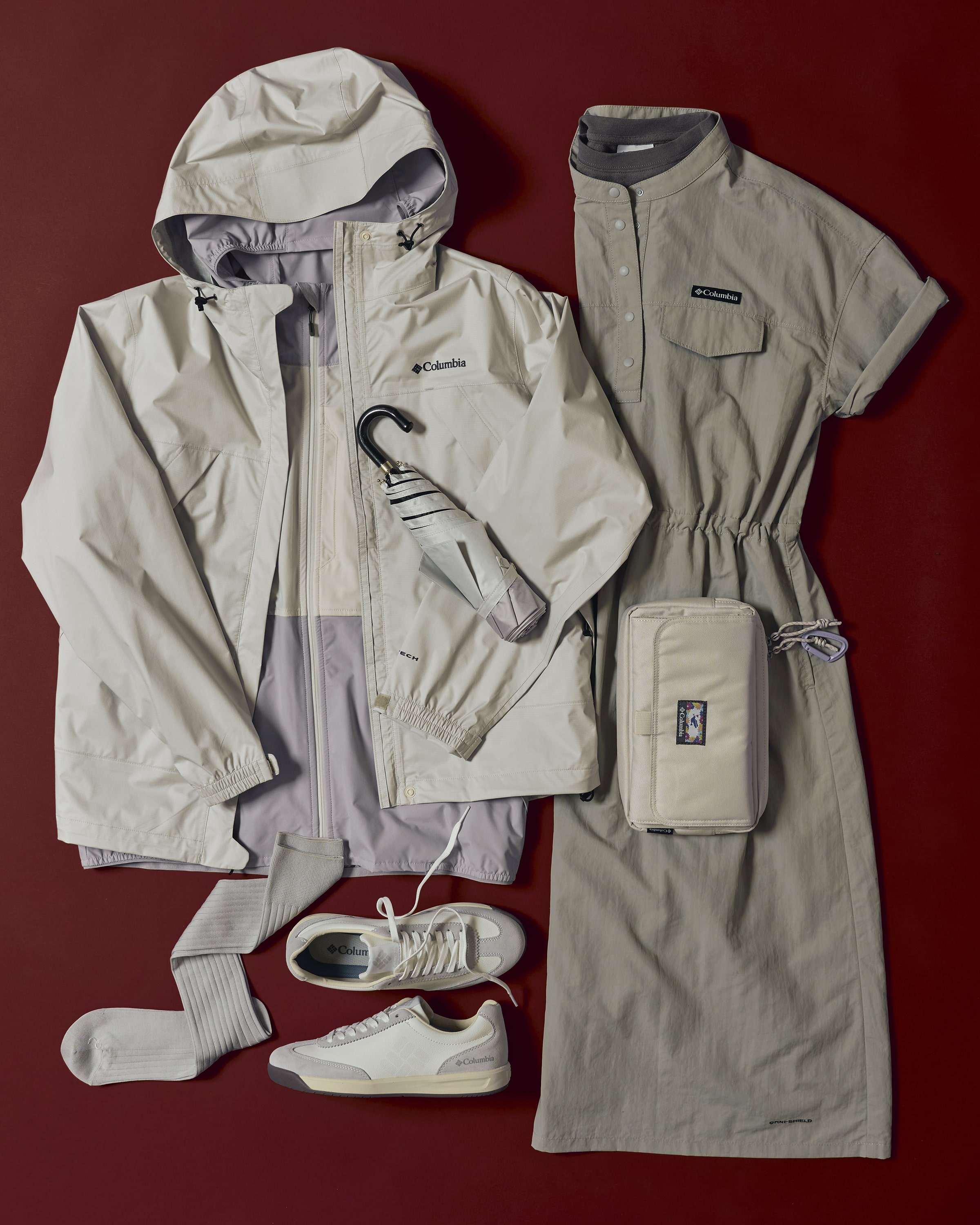 ⾬の⽇こそ映える、晴⾊のシェルジャケットを主役にしたパステルカラーのコーディネート。15〜20℃の⾬天でも快適に過ごせる機能性を備え、軽やかで爽やかな柔らかい印象に。曇りがちな天気でも気分を上げてくれるスタイル。