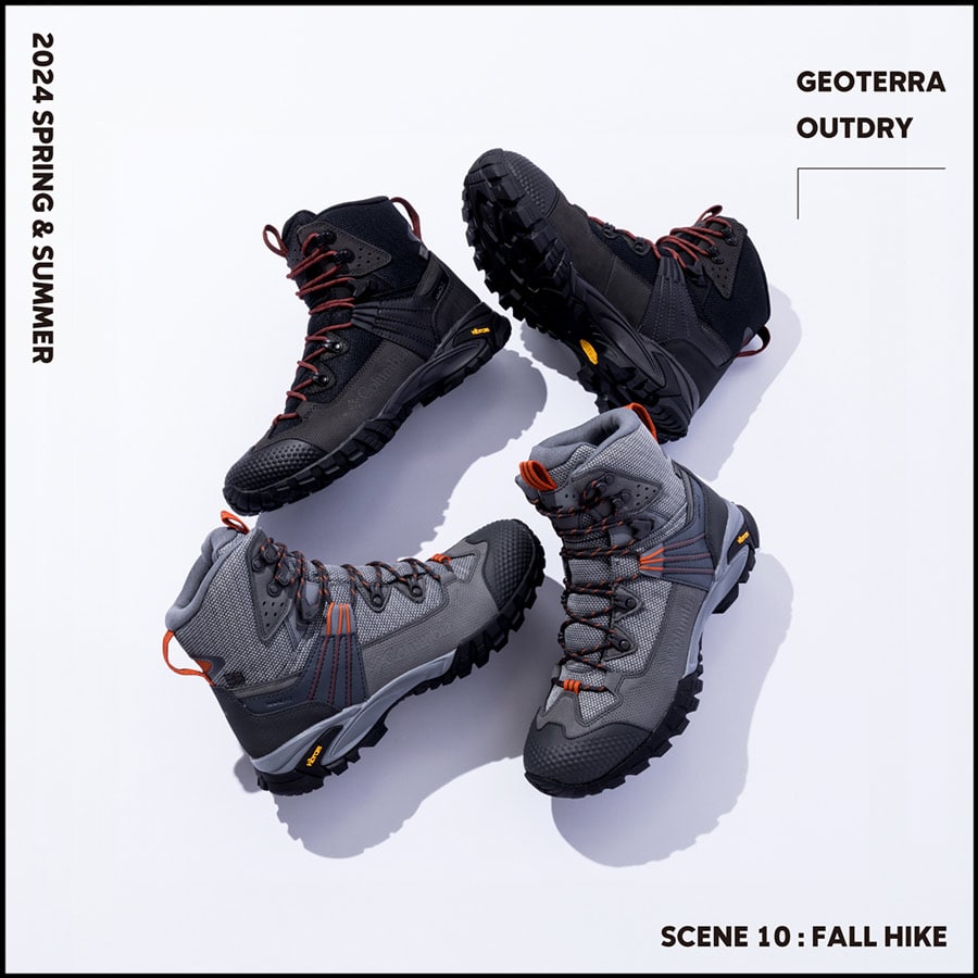 また、独自の防水機能アウトドライ備えた「ジオテラ アウトドライ」は、高所登山などのハードなハイキングに対応した新作のハイキングシューズです。アウトソールには過酷な環境下でも高いグリップ性とトラクションを発揮するアウトソールコンパウンドのヴィブラムエックスエストレックを搭載し、安全性と快適性の向上を実現したアッパーフィットシステムナビックフィットを採用しています。
