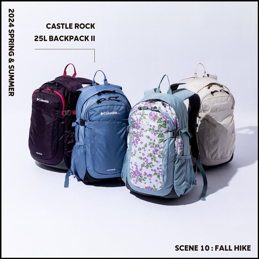 日帰り登山に最適なコロンビア定番のバックパック「キャッスルロック25LバックパックⅡ」は、はっ水機能オムニシールドを搭載しているほか、風飛び防止ベルト付きのレインカバーが付属しています。内部にはオープンポケットやファスナー付きのポケットを採用しているので、小物の整理にも便利です。また、豊富なカラバリを揃えているので、シーンに合わせてカラーをお選びいただけます。