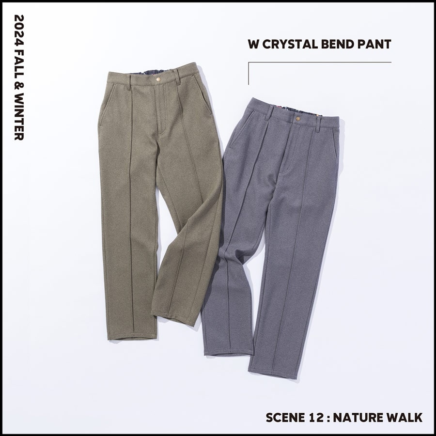 ウールライクなポリエステル素材を使用した「ウィメンズクリスタルベンドパンツ」は、オムニシールド搭載で天候の変わりやすいアウトドアシーンでも安心です。程よくゆとりのあるフィット感のテーパードレッグに仕上げています。