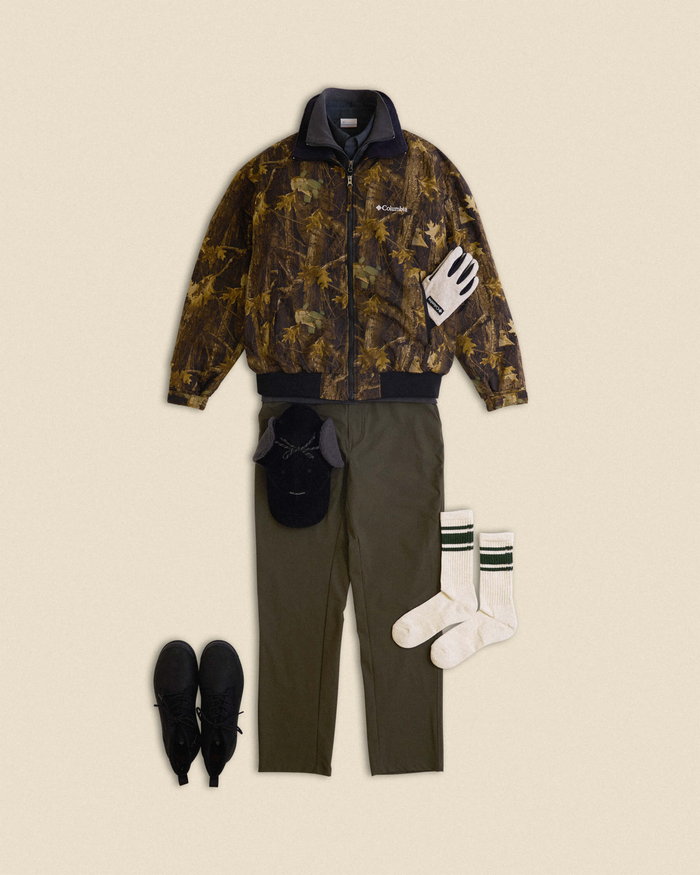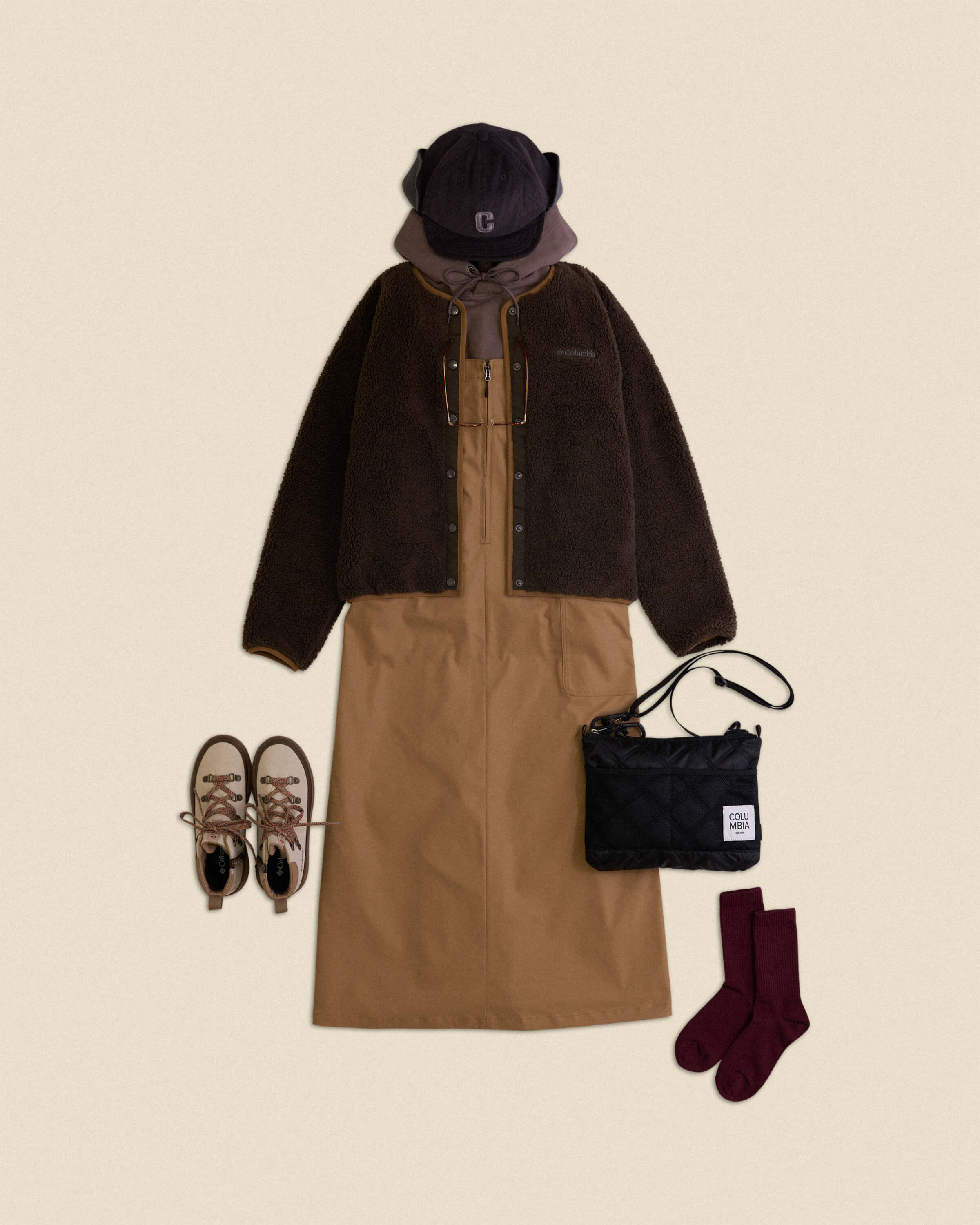 空気がひんやりする晴れの日に、素材の温もりを感じるスタイリング。ブラウン×キャメルの穏やかなトーンに、トープのフーディで抜け感をプラス。お手持ちの差し色ソックスを合わせて、さりげなく季節感を楽しんで。