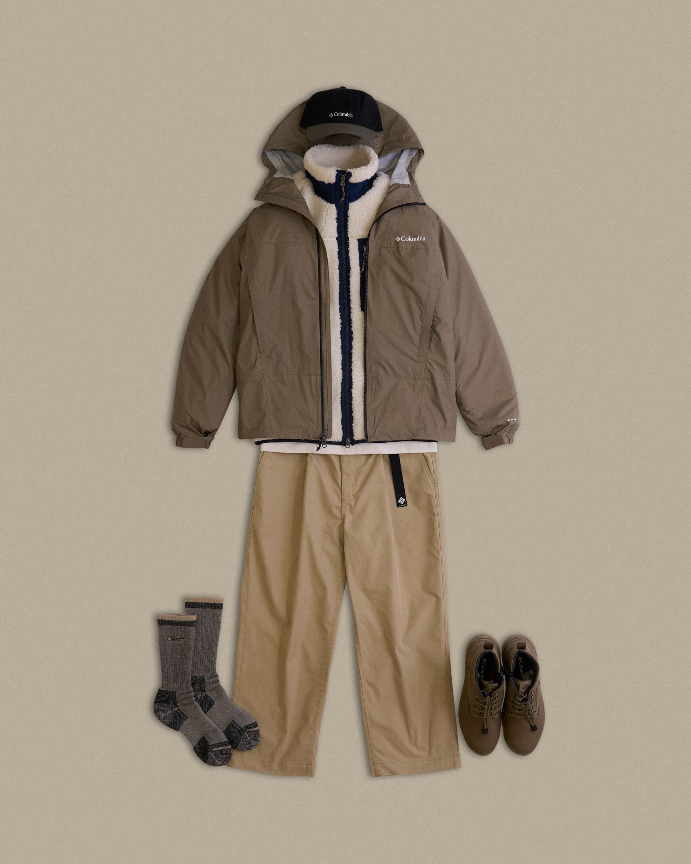 防風仕様のボアジャケットで防寒しながら、レインウェアを重ねれば雨にも気温差にも対応。ボアのぬくもりとレインシェルのハリ感が絶妙にマッチし、ベージュトーンでまとめた機能的でスマートなスタイル。