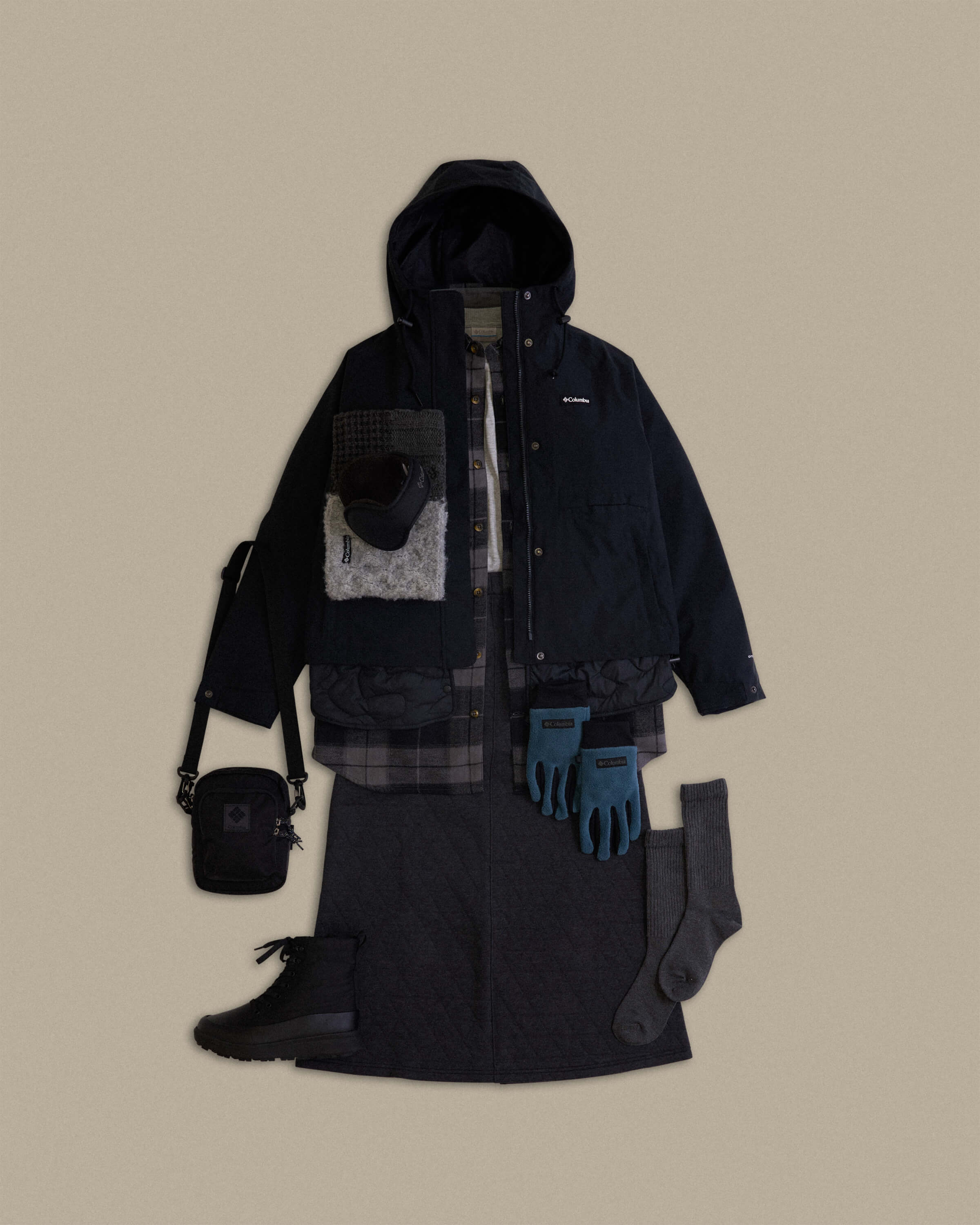 ライナー付きジャケットで、天候や気温に合わせて自在に着まわせるスタイリング。あえてゆったりとしたメンズのネルシャツを合わせ、こなれ感をプラス。トーンを揃えた異素材の組み合わせで、奥行きのあるモノトーンコーデに。