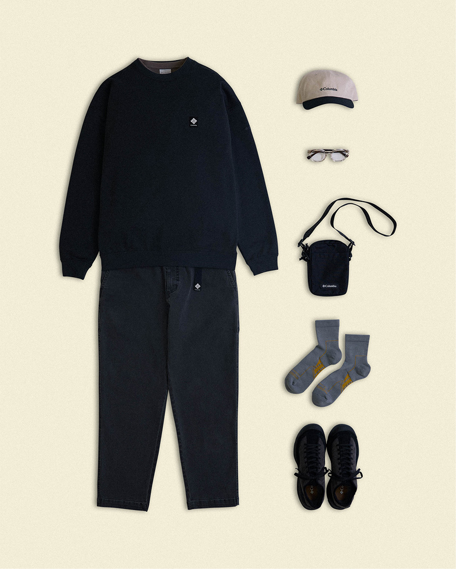 色褪せブラックスウェットにブラウンのロングTシャツを首元から覗かせ、ウォッシュブラックデニムでラフさとこなれ感をプラス。キャップとクリア眼鏡で軽さを出し、ブラックスニーカーとコンパクトショルダーで引き締めた都会的モノトーンカジュアル。