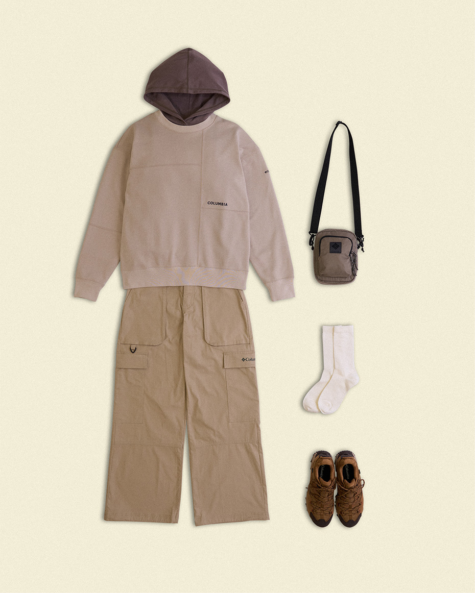 淡ベージュのスウェットにトープカラーのフードを重ねた柔らかな配色。カーゴパンツで機能性を加え、ブラウンのトレッキングシューズで引き締め。小ぶりショルダーで軽快に仕上げた都会的アウトドアコーデ