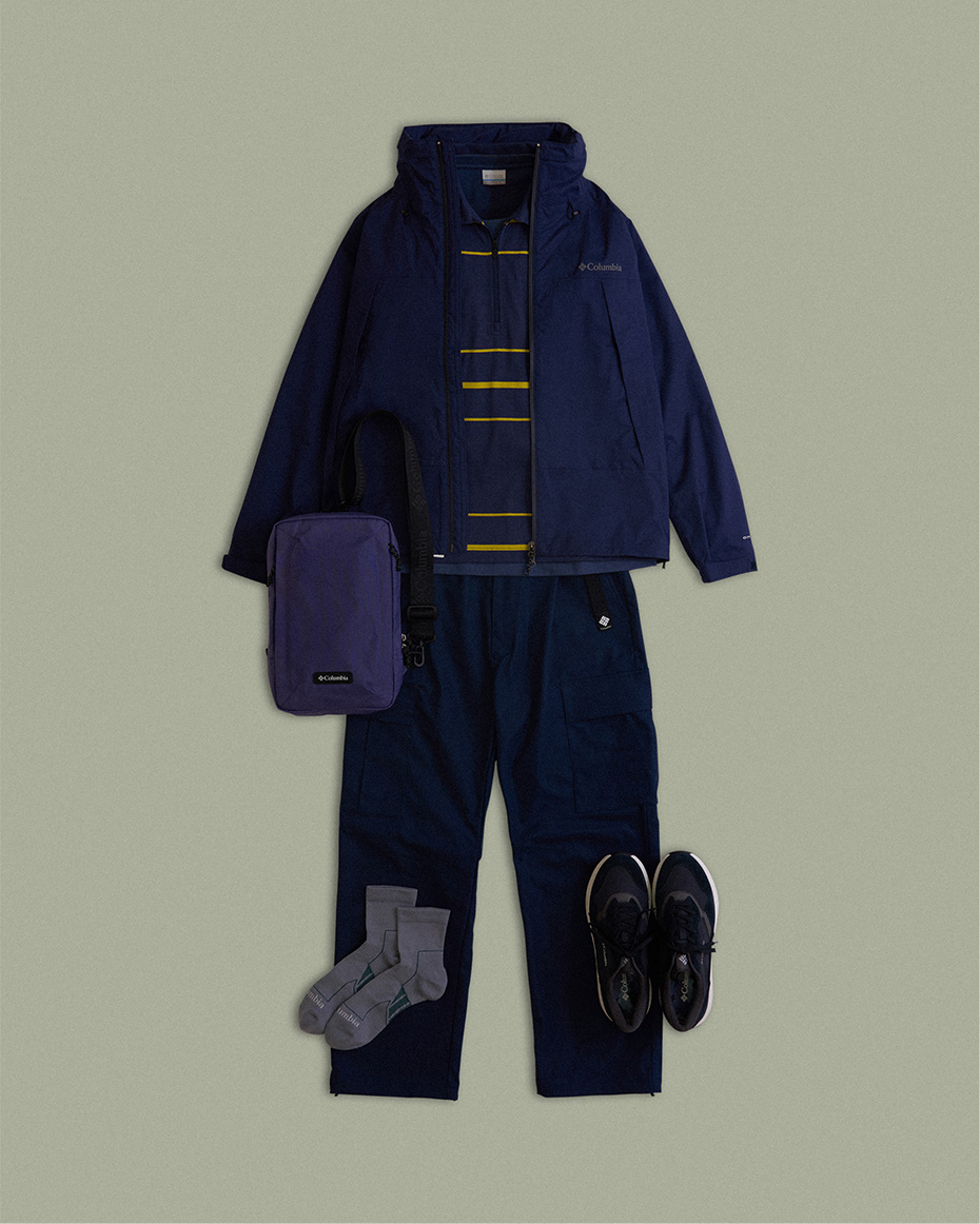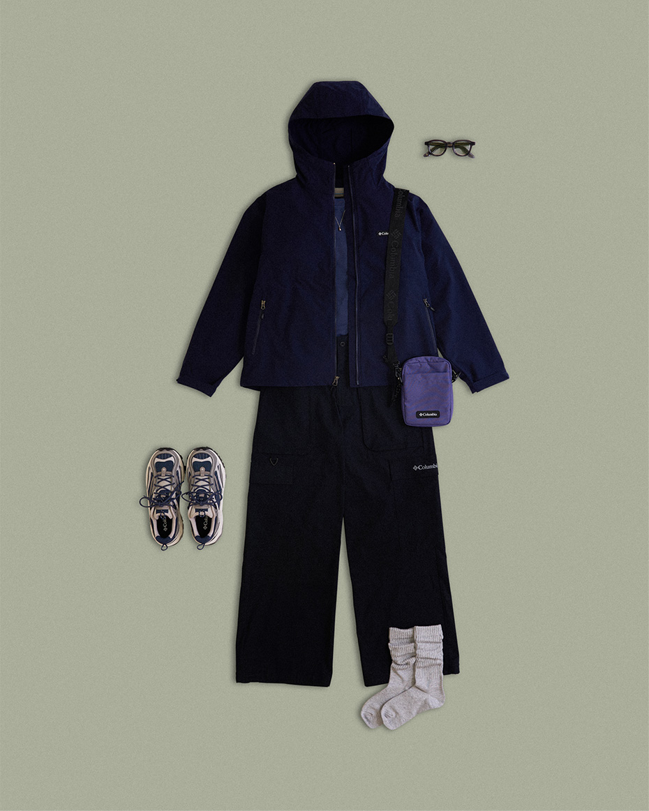 ネイビージャケットとパンツで統一感を出し、インナーとバッグにラベンダーを差し色。スニーカーもネイビーでリンクし、グレーソックスで抜け感をプラス。都会とアウトドアを繋ぐ洗練スタイル。