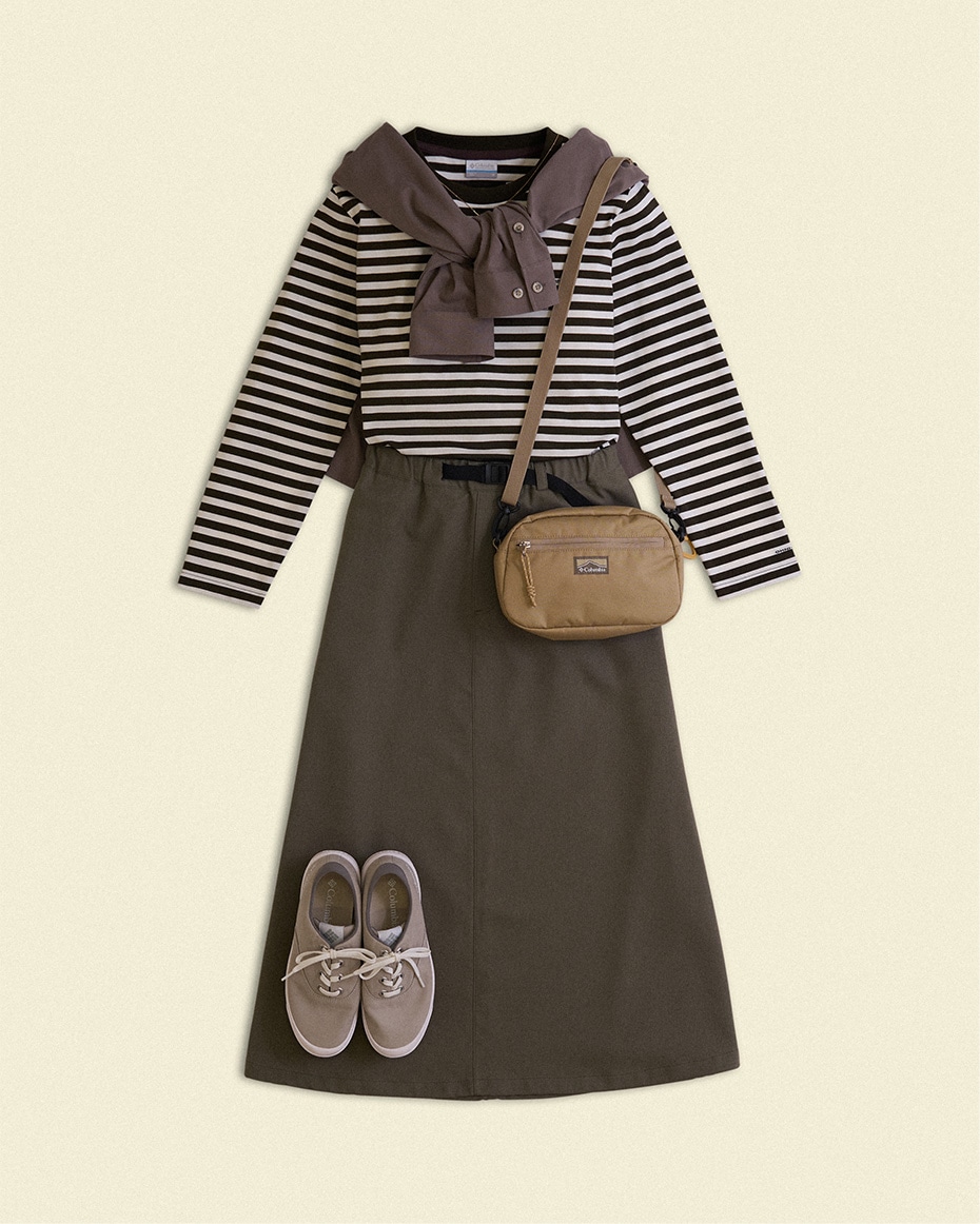 白×黒ボーダーにオリーブのロングスカートを合わせた秋色マリン。モカブラウンのカーデ肩掛けで奥行きを出し、キャメルバッグとベージュスニーカーで軽やかにまとめた大人のカジュアルスタイル。