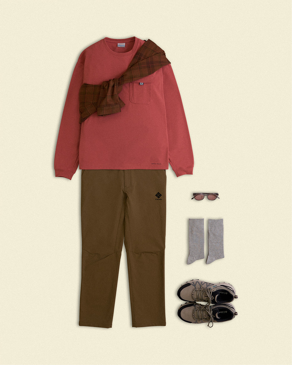 テラコッタのロングTにカーキパンツを合わせ、腰巻きチェックシャツで季節感と奥行きをプラス。グレーソックスとベージュ×ブラックスニーカーで軽快にまとめ、サングラスで都会的なアクセントを加えた秋のアウトドアシティスタイル