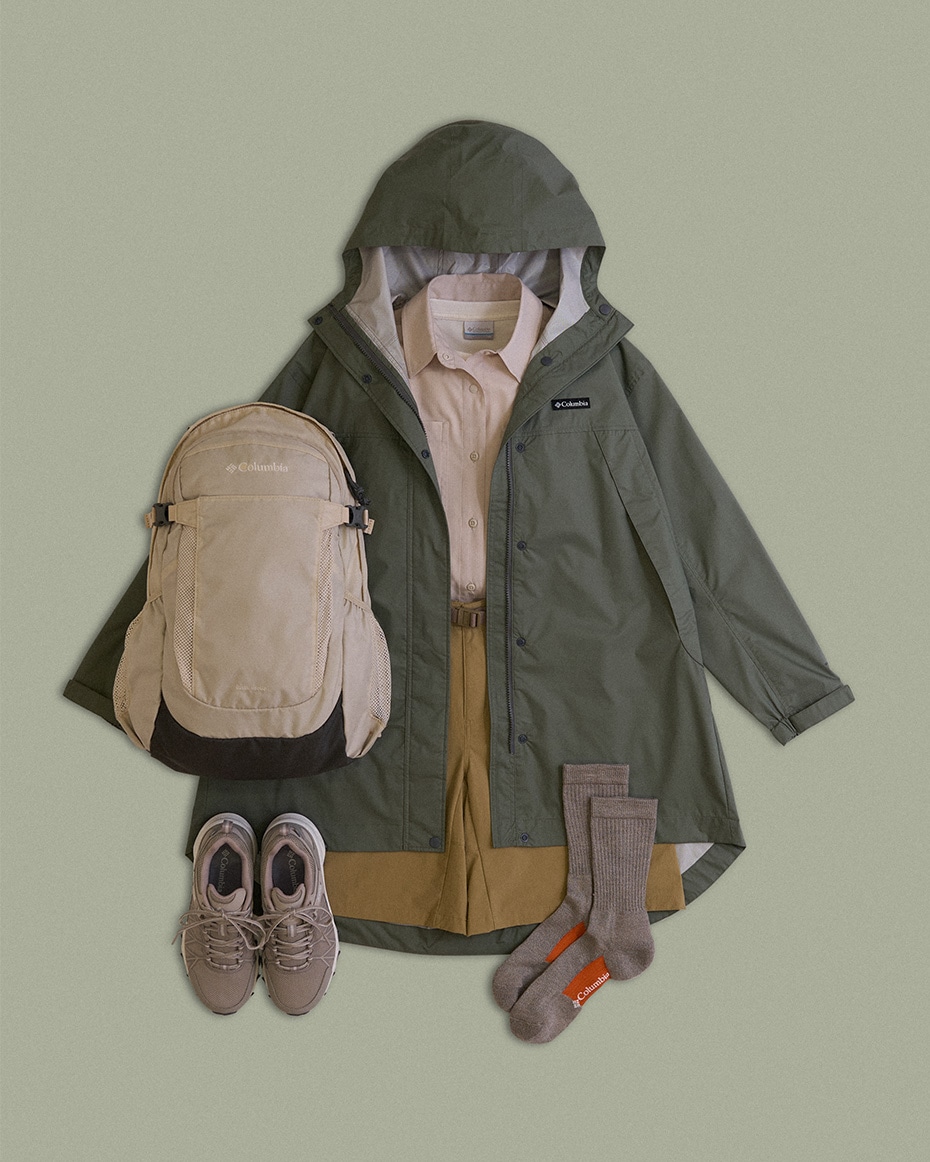 オリーブのロング丈レインジャケットを主役に、ベージュシャツとキャメルショーツで軽快に。ナチュラルな配色で統一し、ソックスのロゴで遊び心をプラス。山歩きから街旅まで活躍するアースカラーコーデ。