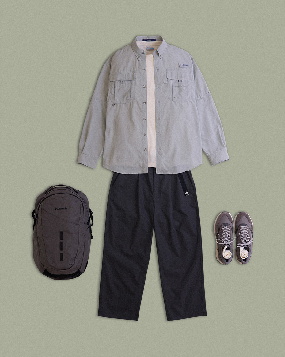 ブルーグレーやミントグリーンのシャツを主役に、グレートーンやブラックパンツで引き締め。ホワイトTやグレースニーカーで軽やかさをプラスし、バックパックでアウトドアと都会の両方に対応する大人のリラックススタイル