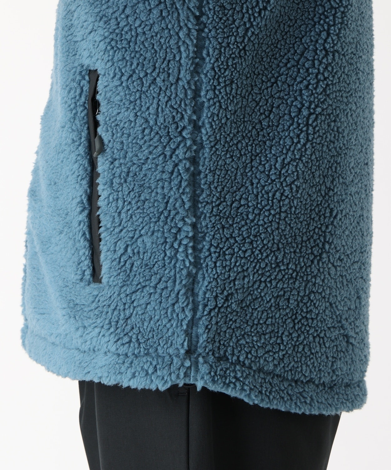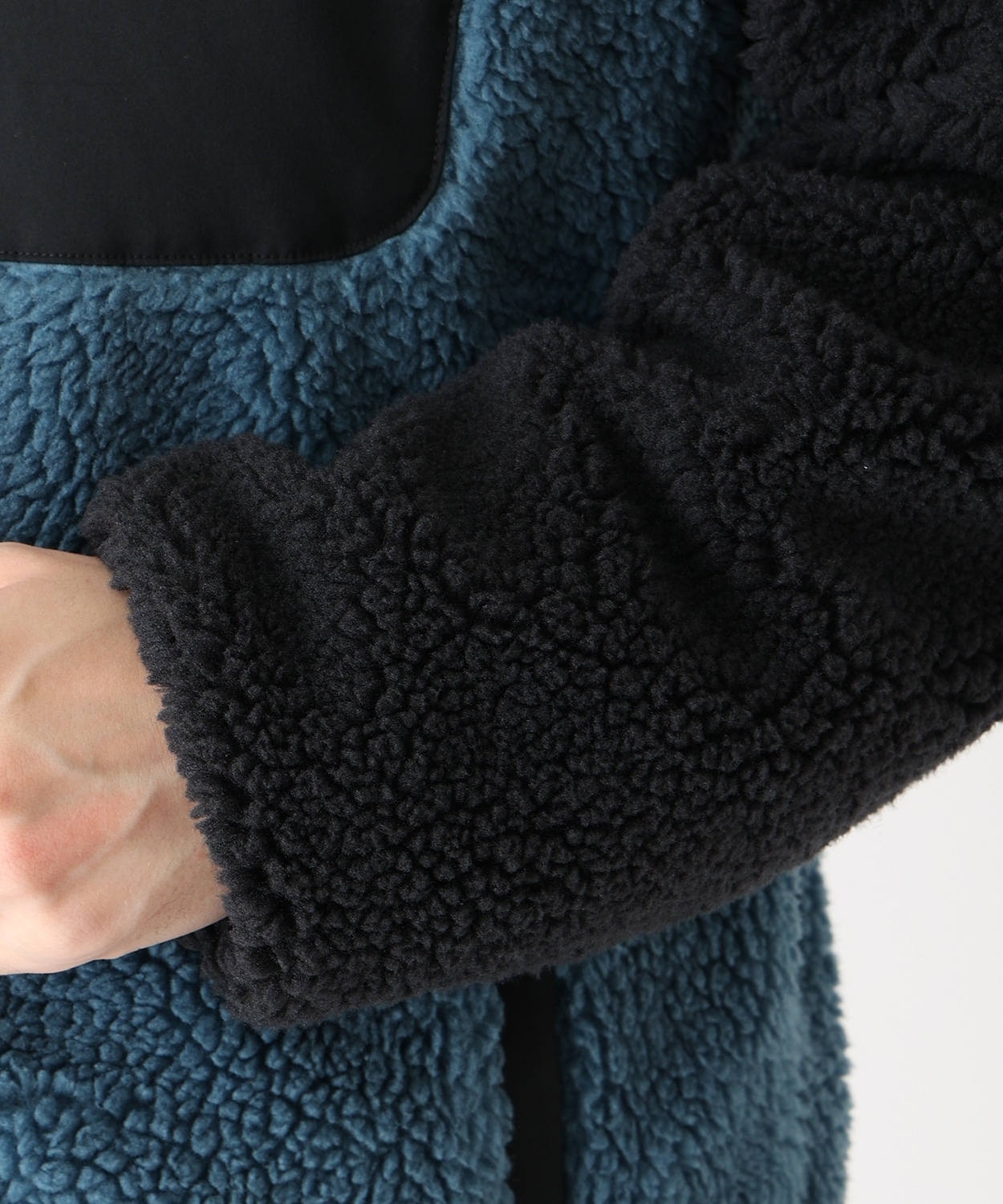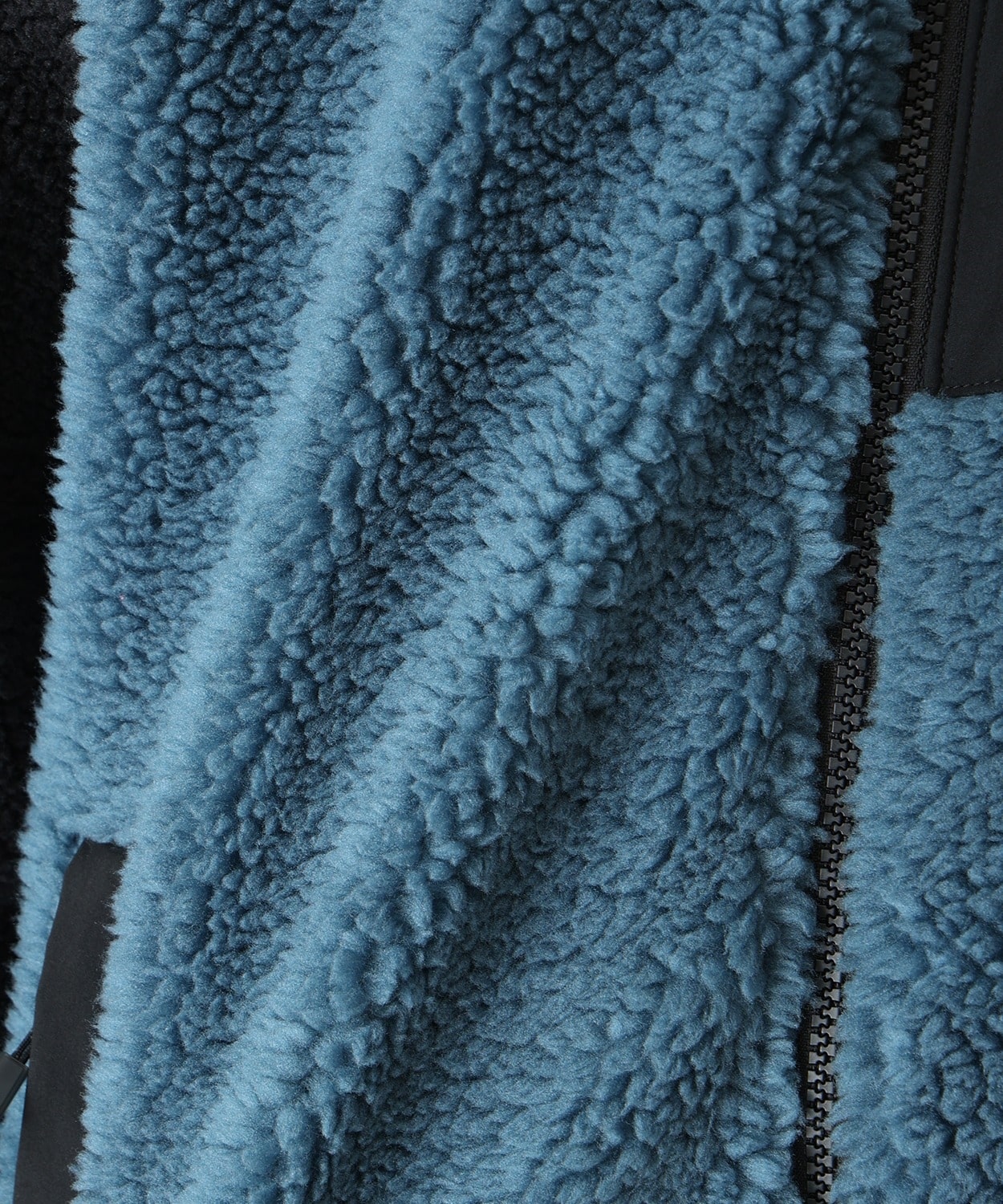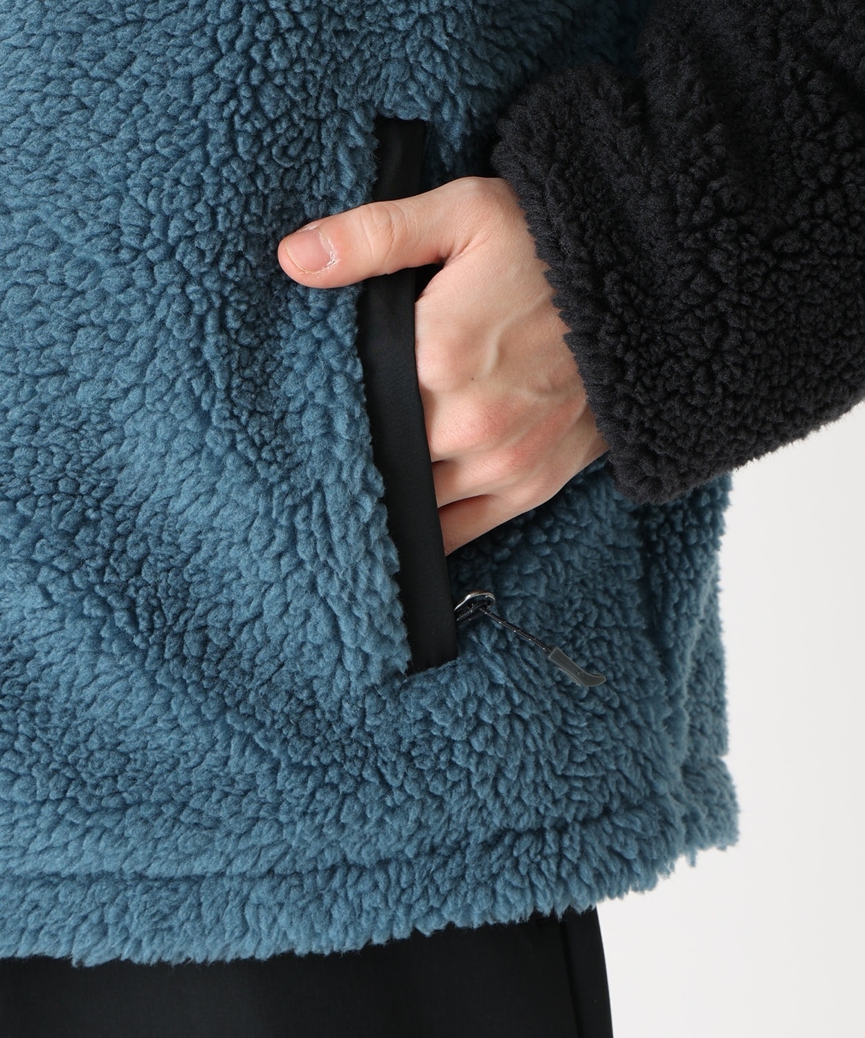 ソフトなボアフリース素材をベースに、部分的にナイロン素材切り替えを施したジャケット。