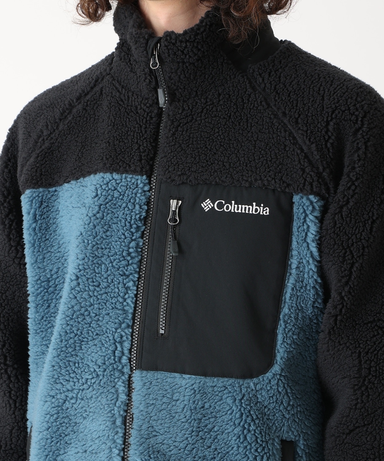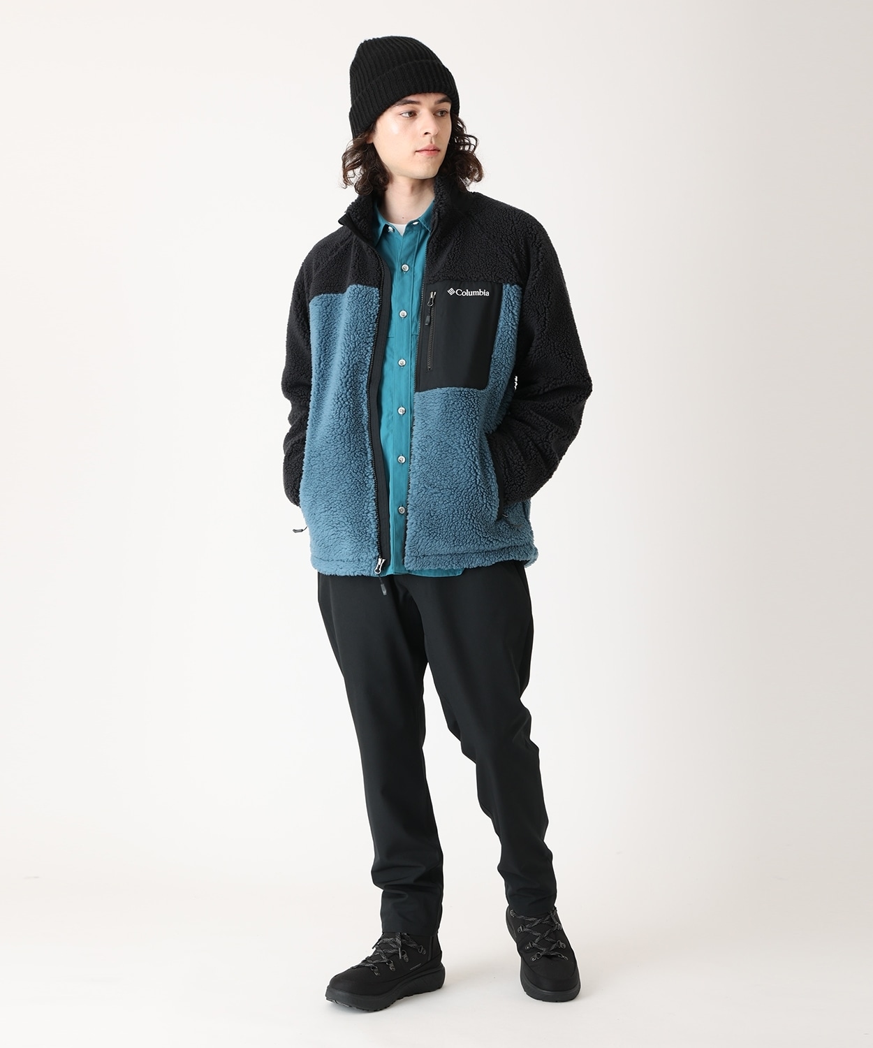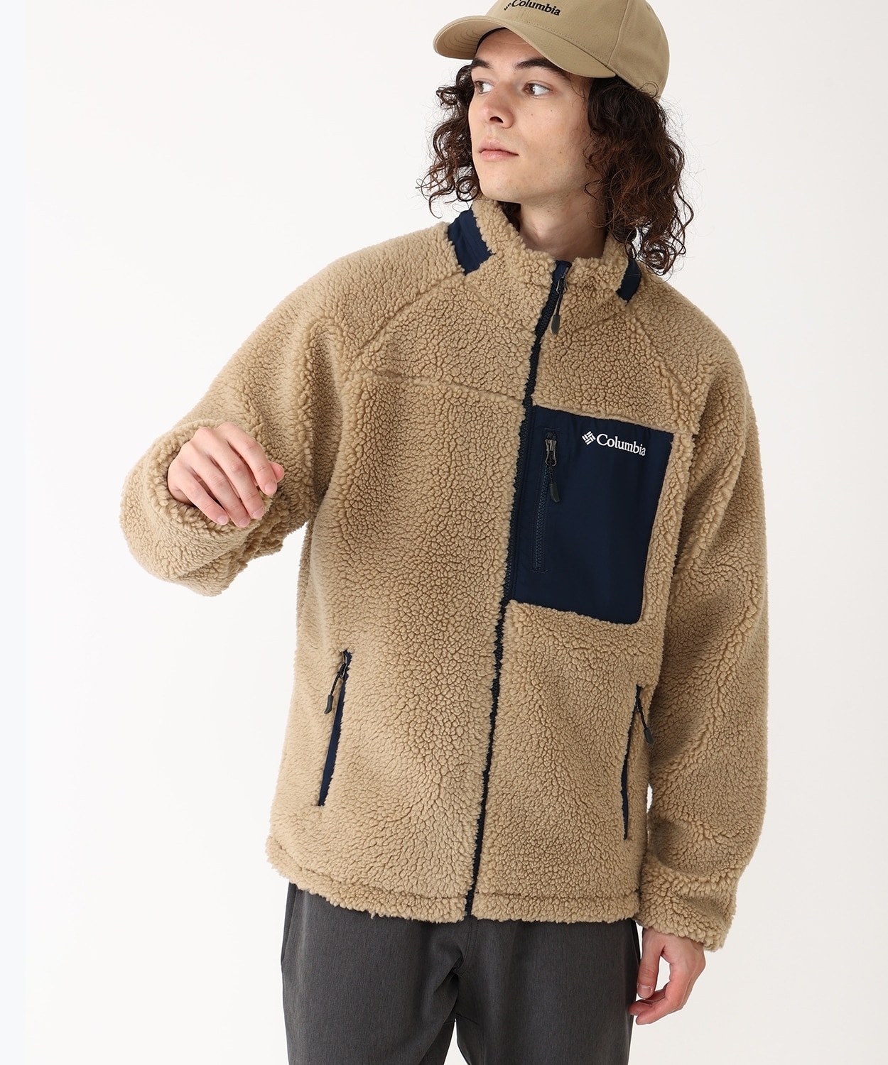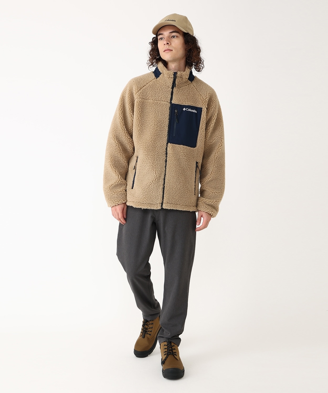 ソフトなボアフリース素材をベースに、部分的にナイロン素材切り替えを施したジャケット。