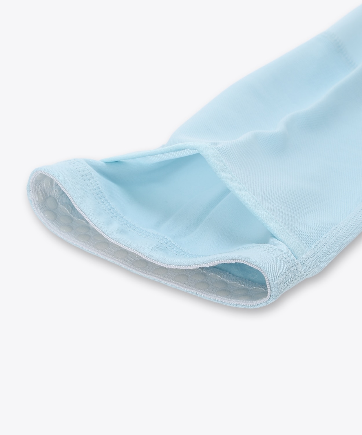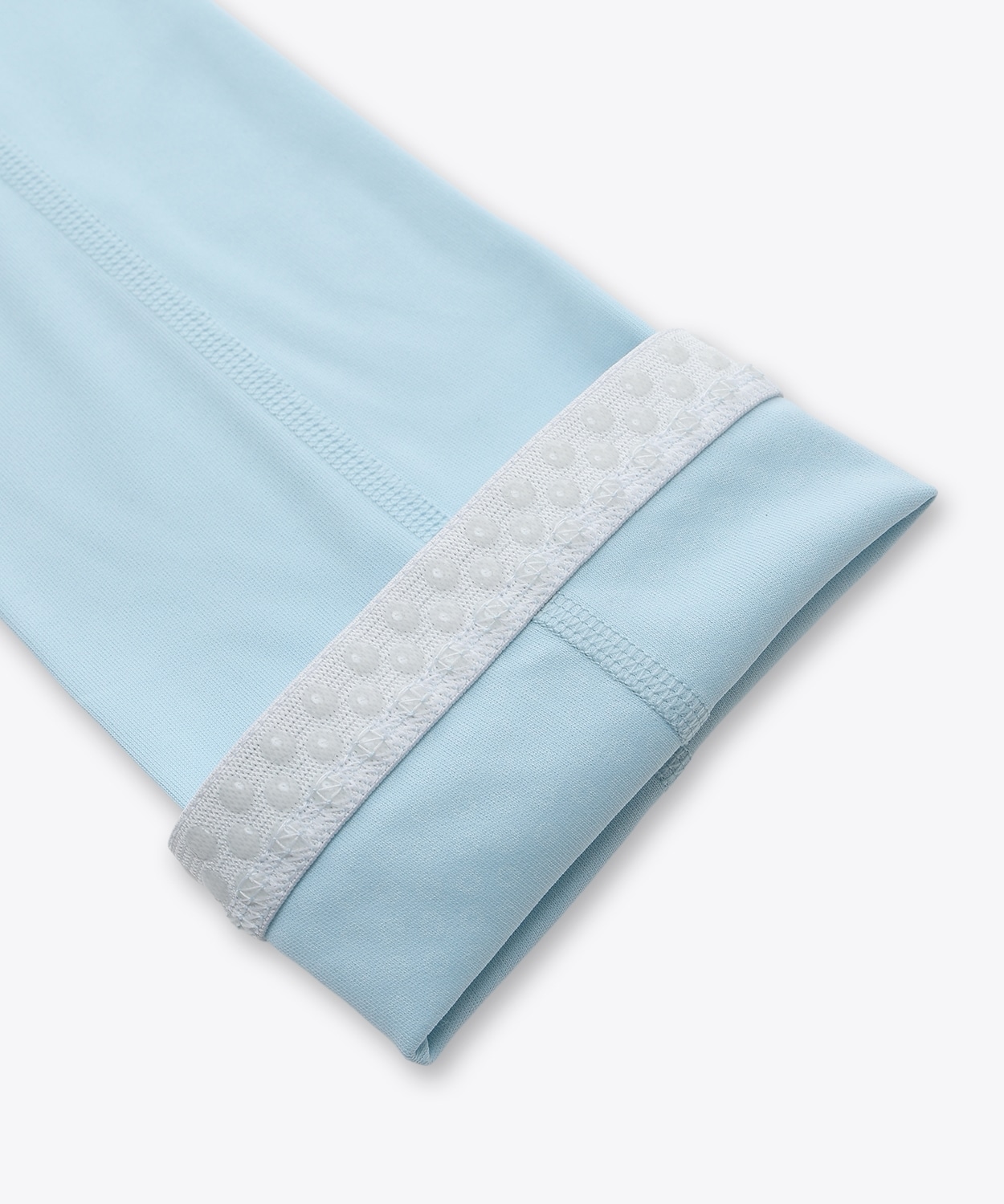 汗を利用して温度を下げる。快適な涼しさを提供する冷却機能。冷却材である小さな青いサークルが、汗を利用して生地全体の温度を瞬時に下げ、持続的なクーリングを提供。気温が高い状況においてもドライで快適な着心地を実現します。