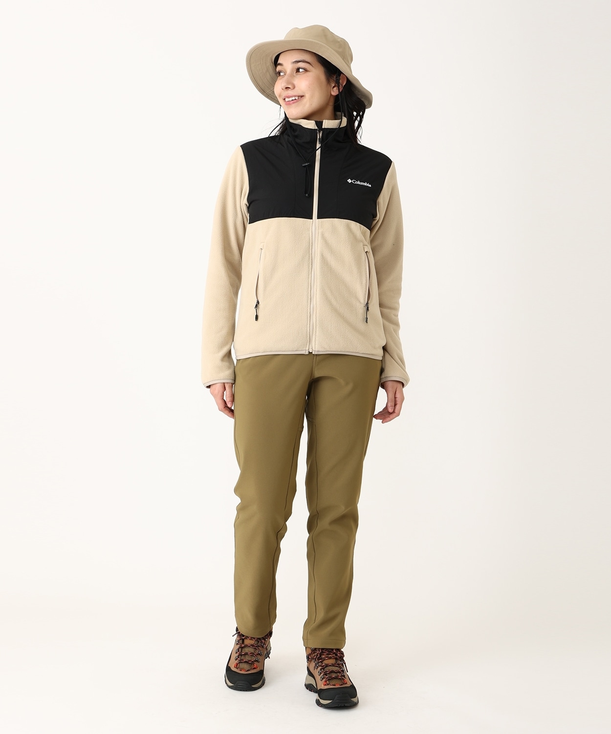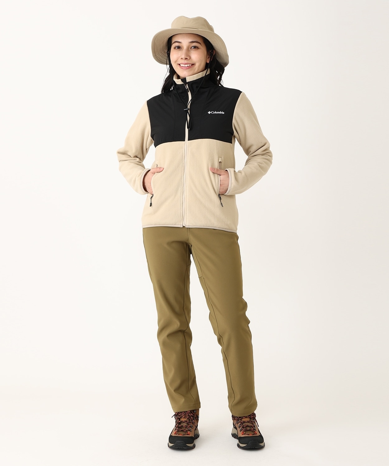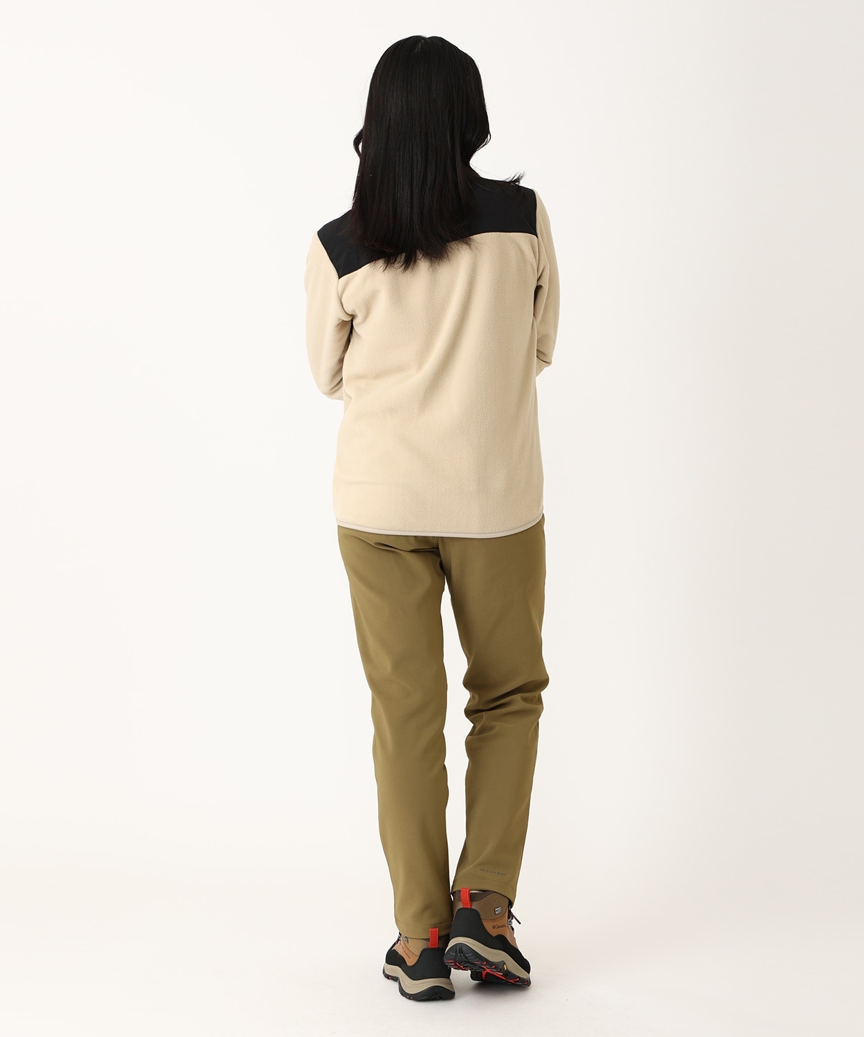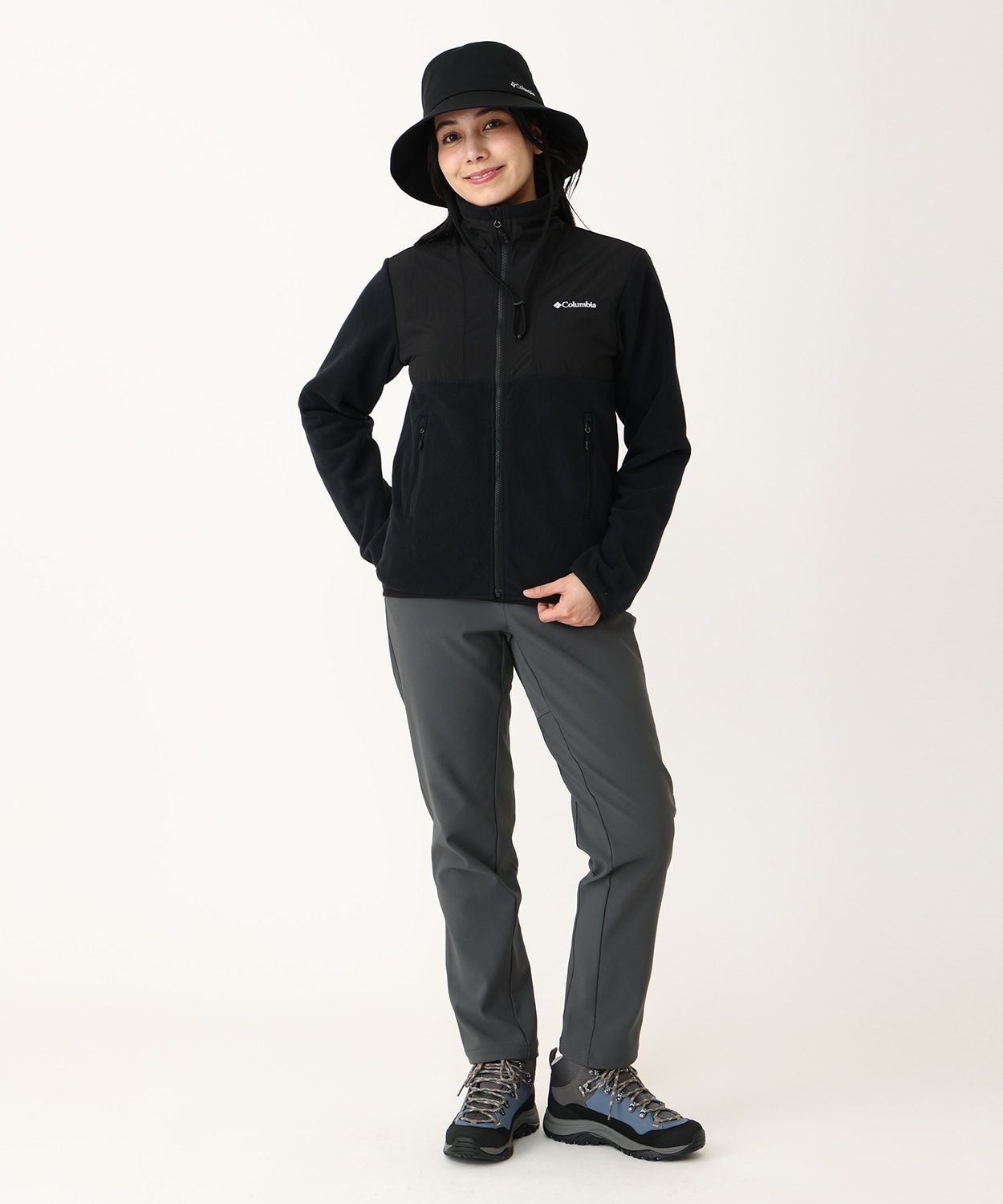 コロンビアの特徴でもある、立体的な前襟パターンのビブネックラインが着用時の快適性を高め、胸元から首元にかけては、はっ水(撥水)加工のウーブン素材をオーバーレイすることで、ザック使用時の耐久性にも考慮。レイヤリングしやすいフィット感で、ロングシーズンに対応できる一着です。