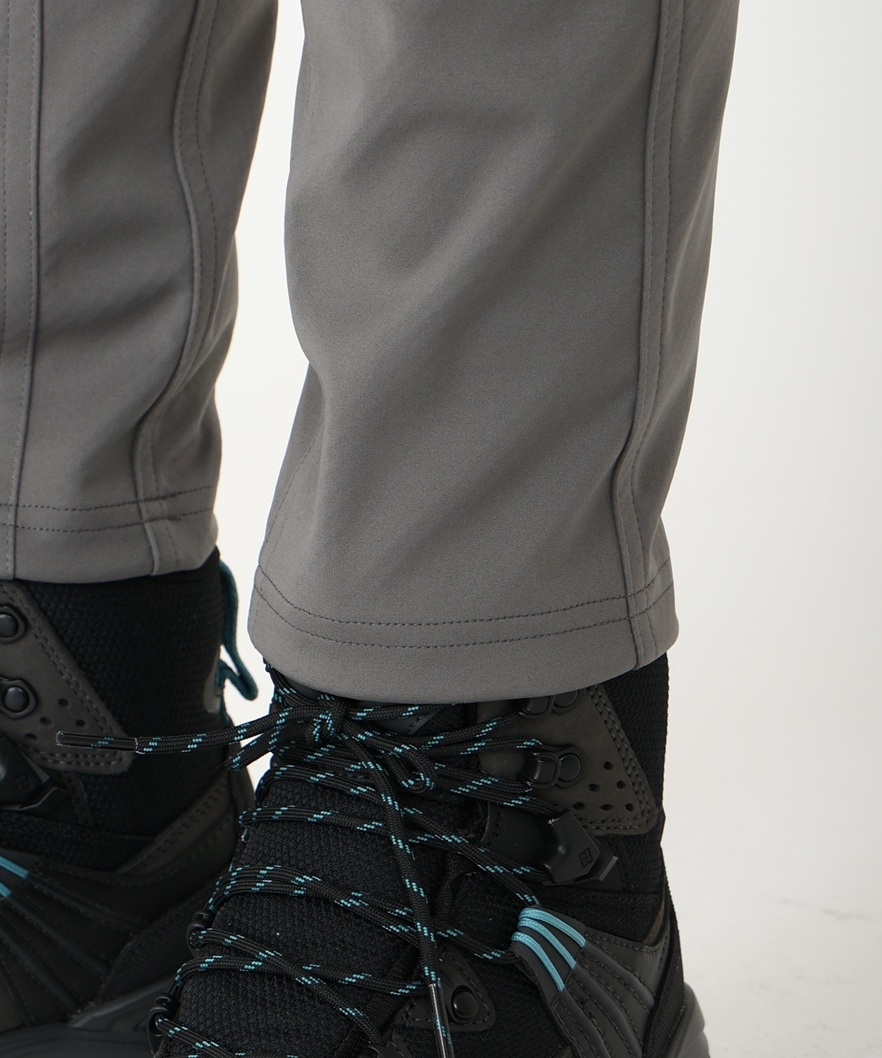 表地は小雨程度の水を弾く、はっ水(撥水)機能を備え、生地の内側には優れた防水性と防風性を発揮するメンブレンを装備。4wayストレッチ素材で行動中も動きやすく、厚手の素材ながらも、すっきりと見せるこだわりのスリムテーパードシルエットで、ハイキングにも日常履きにも適したアイテムです。