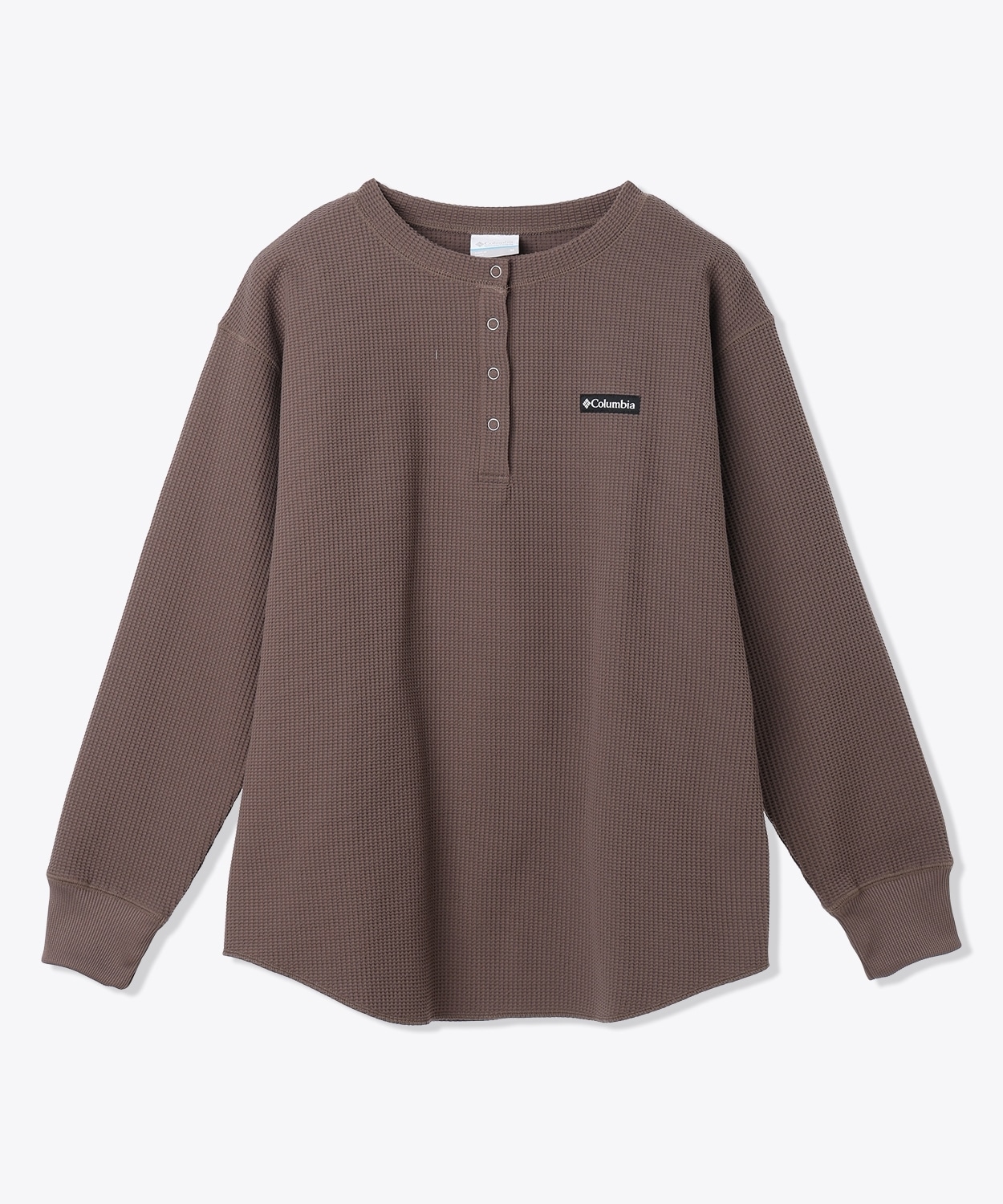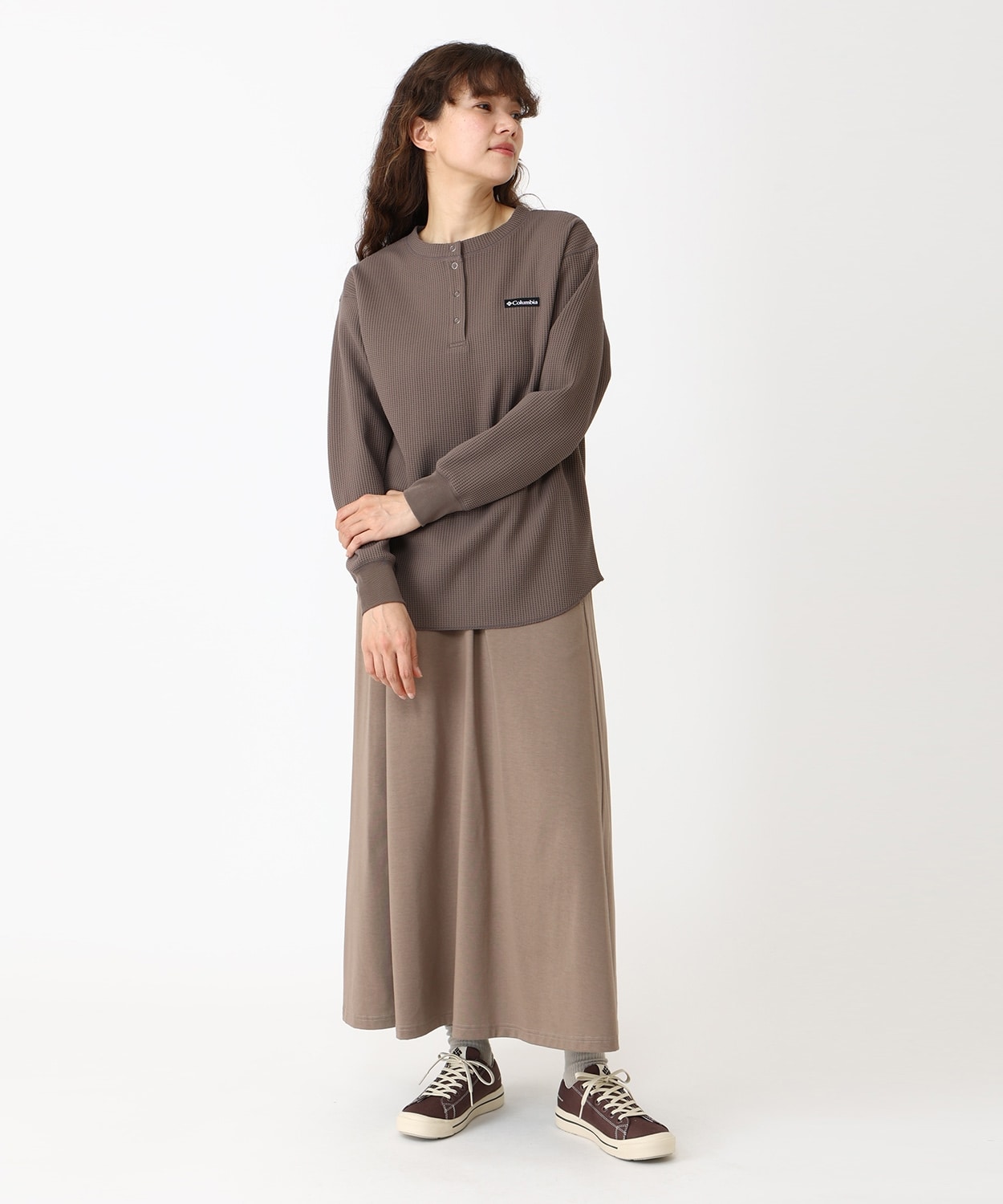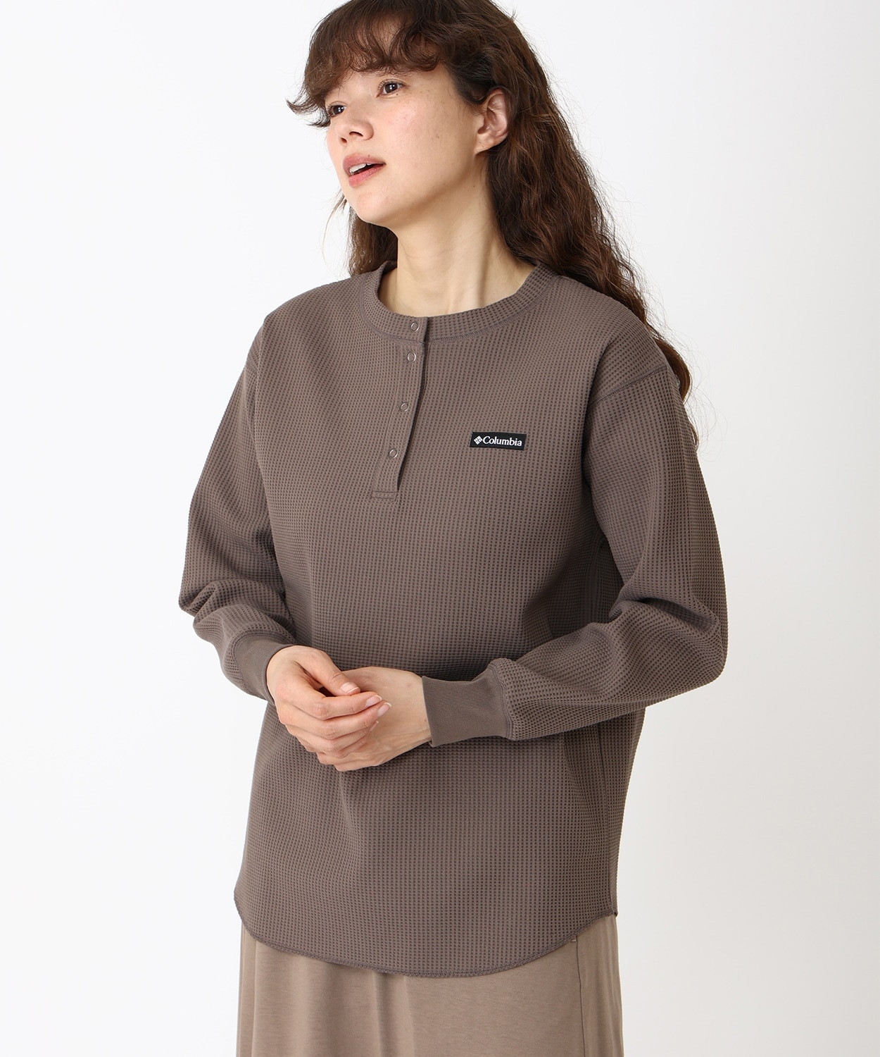 一枚にもレイヤリングにも合わせやすい、カジュアルライクなヘンリーネックのロングTシャツ。