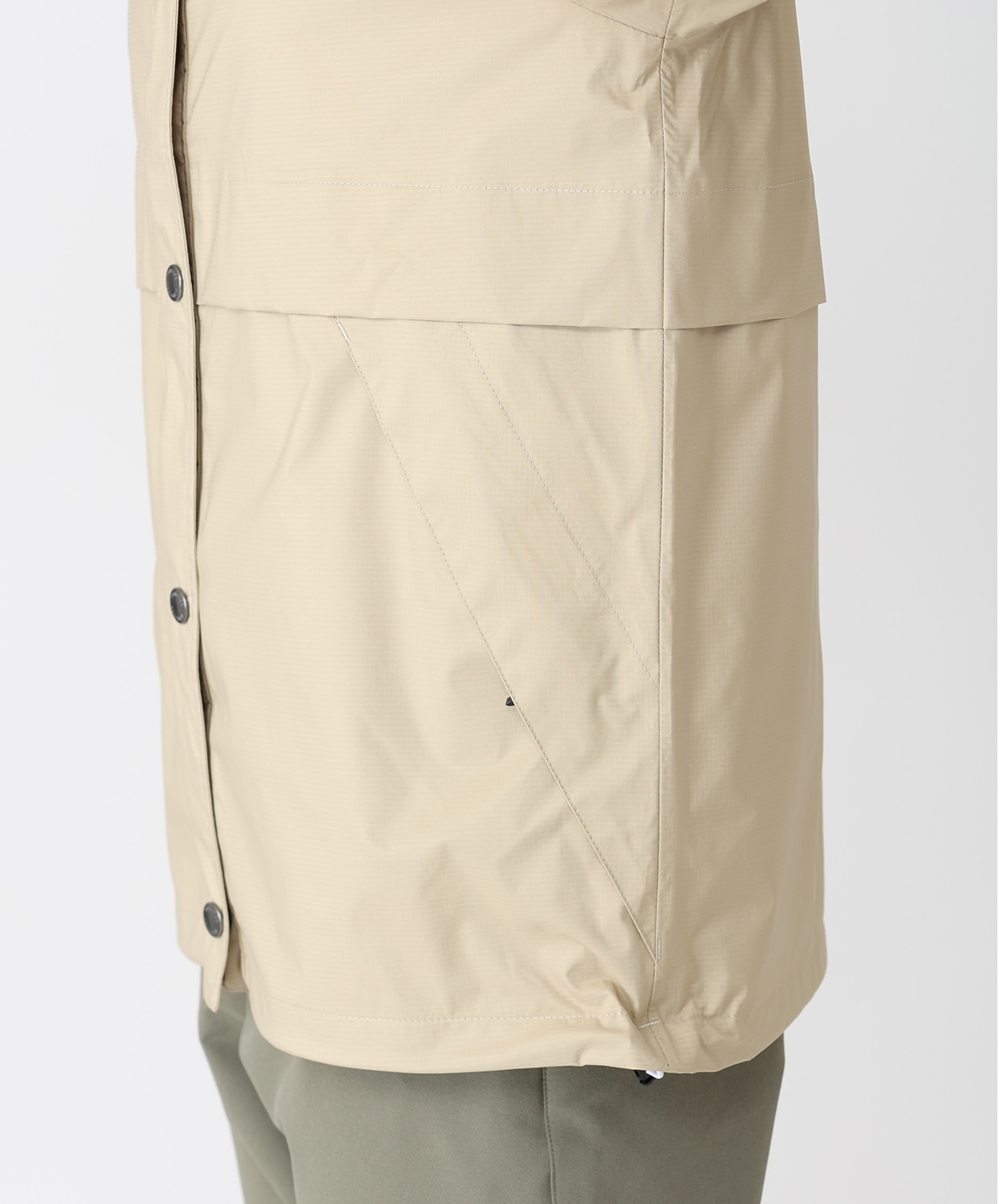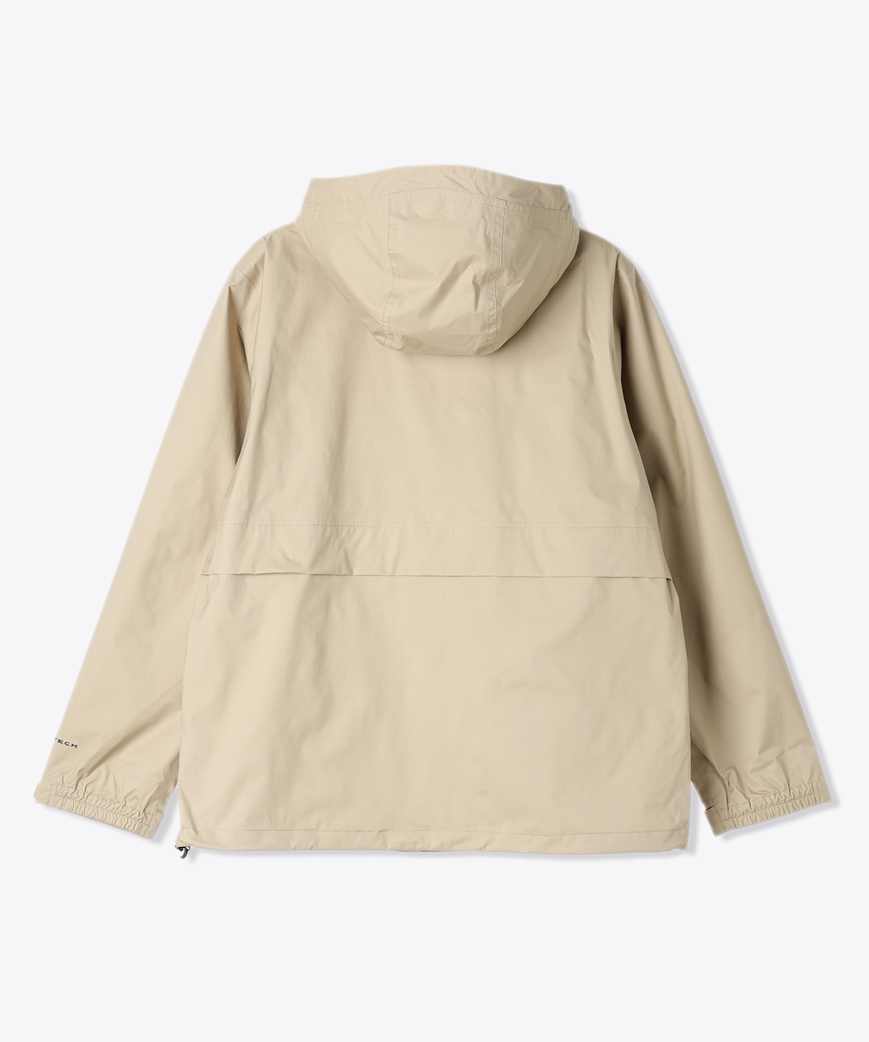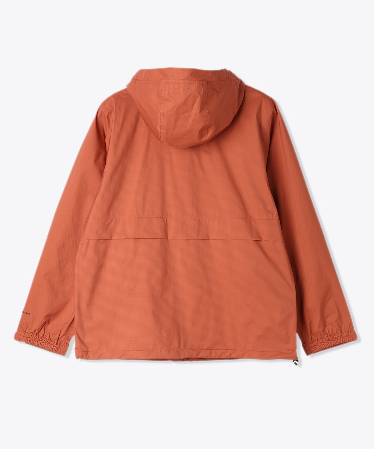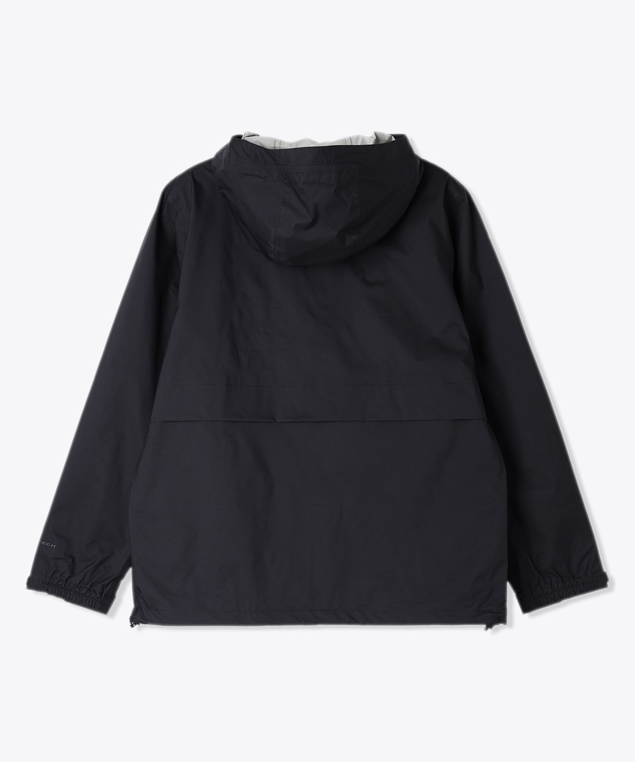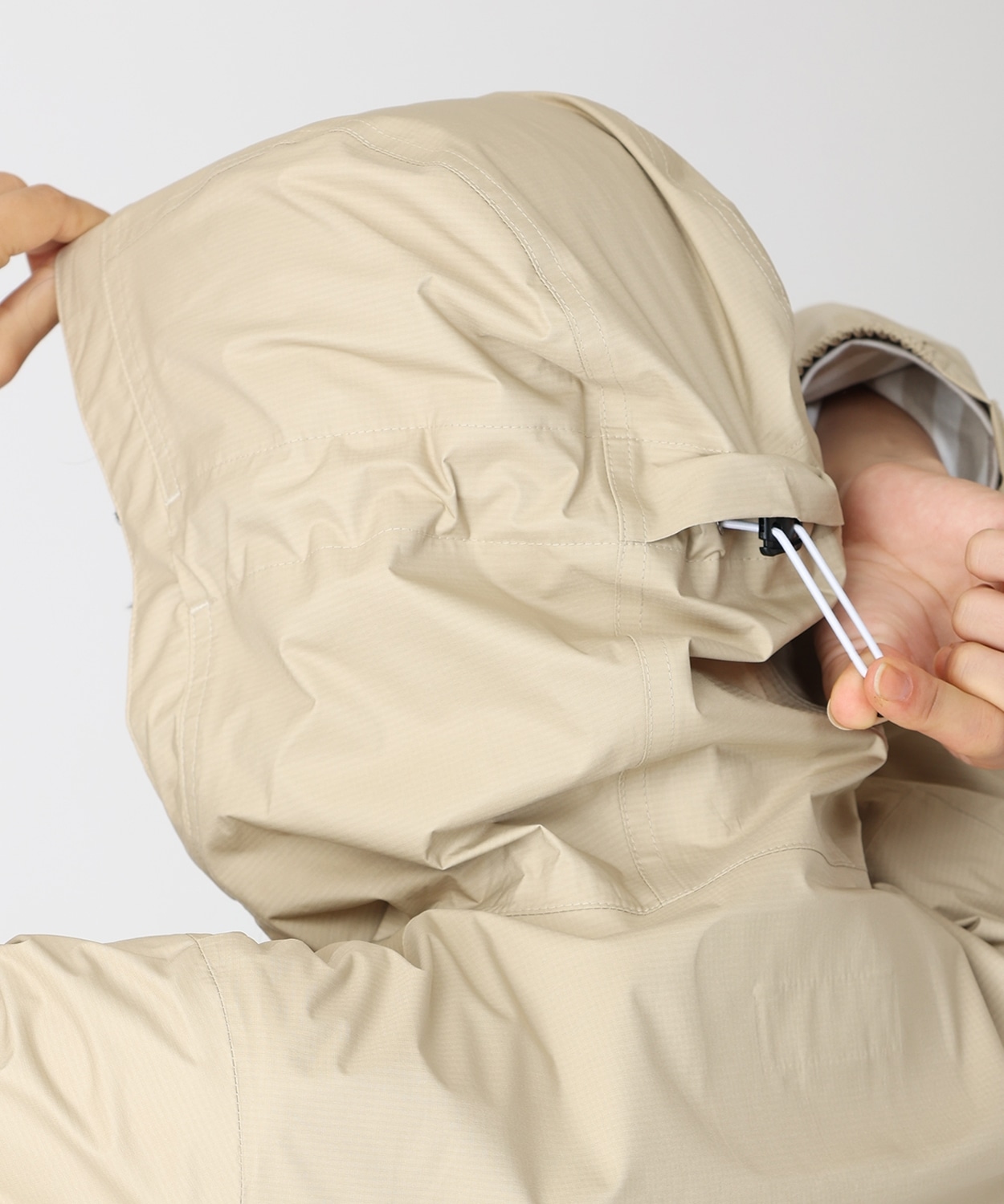 フードを被った際に視野を広く確保するため、フードの後頭部にフィット感を調整できるドローコードを配置しました。また、裾にもドローコードを施し、フィット感を調整するとともに、風の侵入も防ぎます。スタッフバッグを備えているため、コンパクトに収納して持ち運びにも便利です。