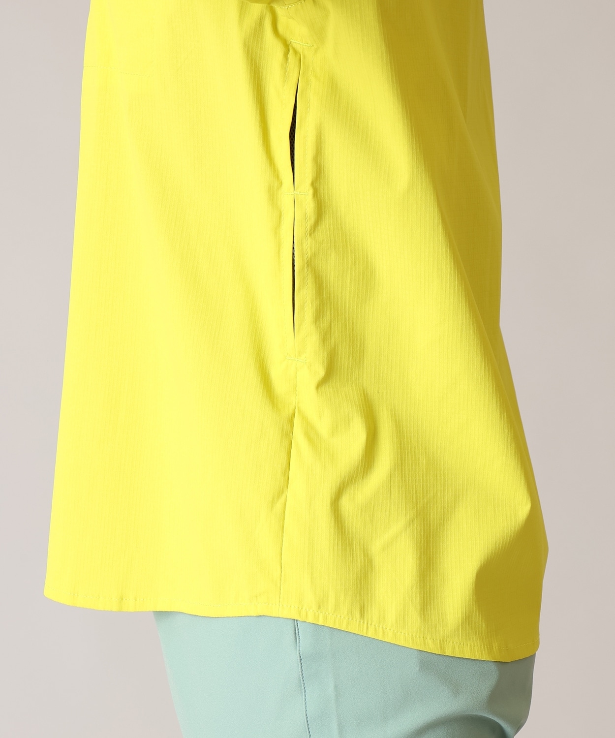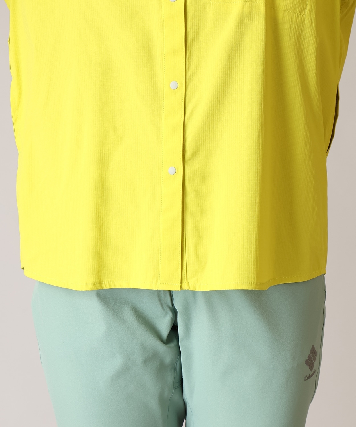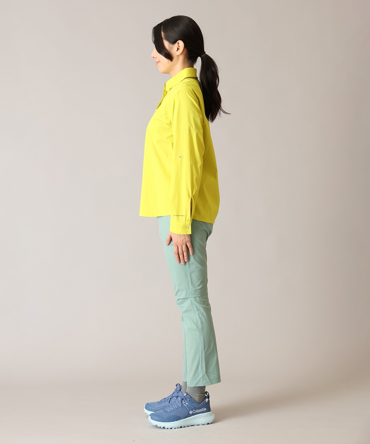・襟:スタンドカラーにもなるボタン付きで首元の日焼けを防止