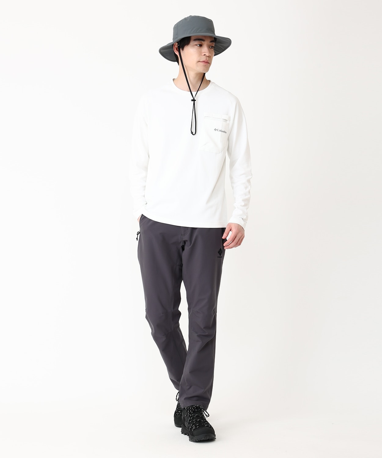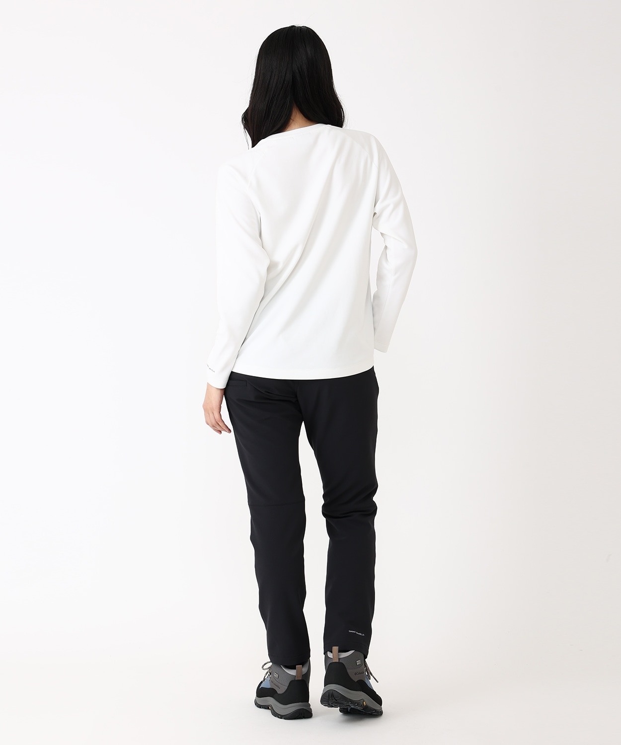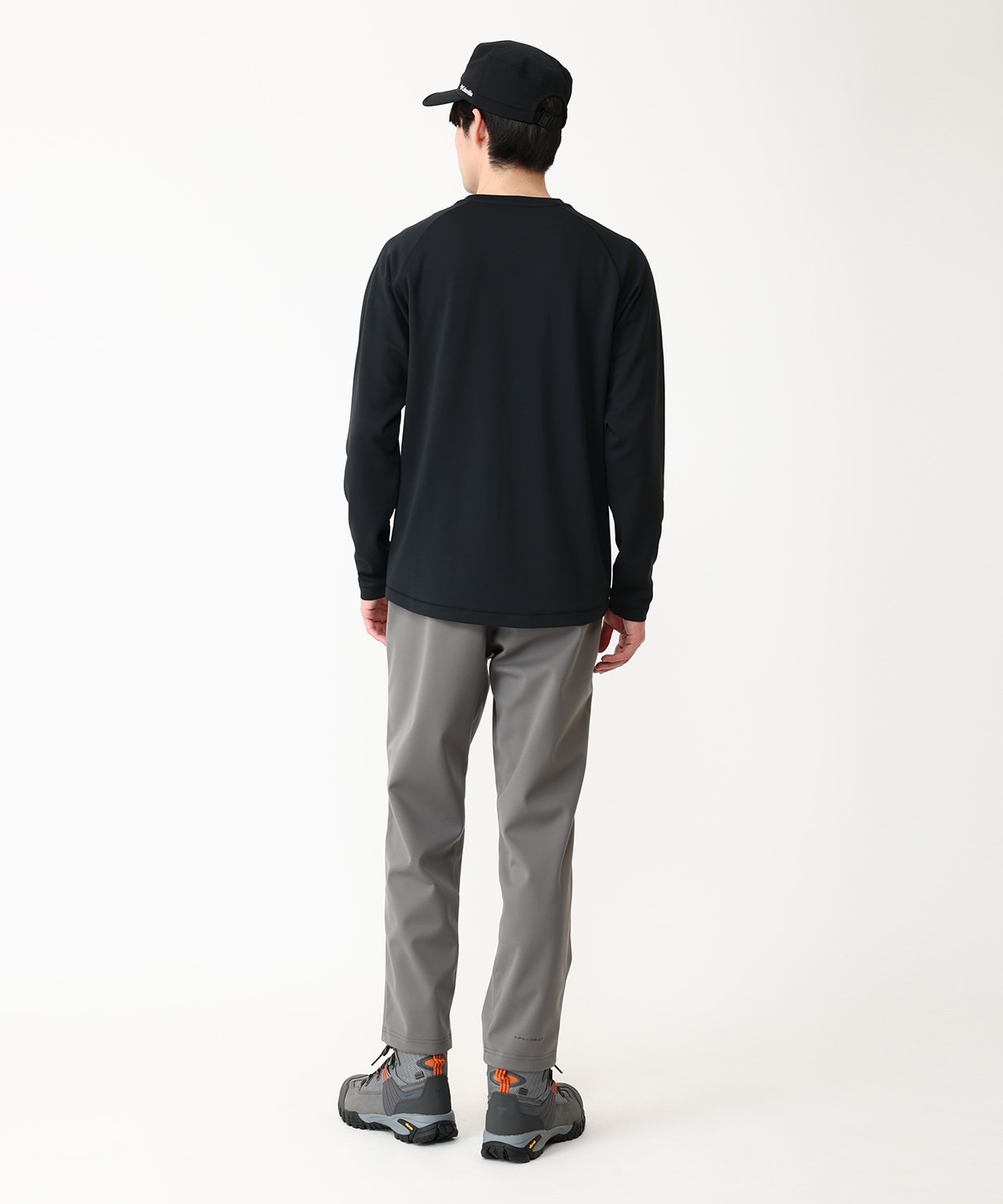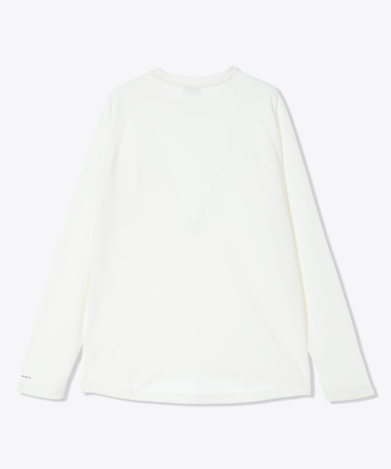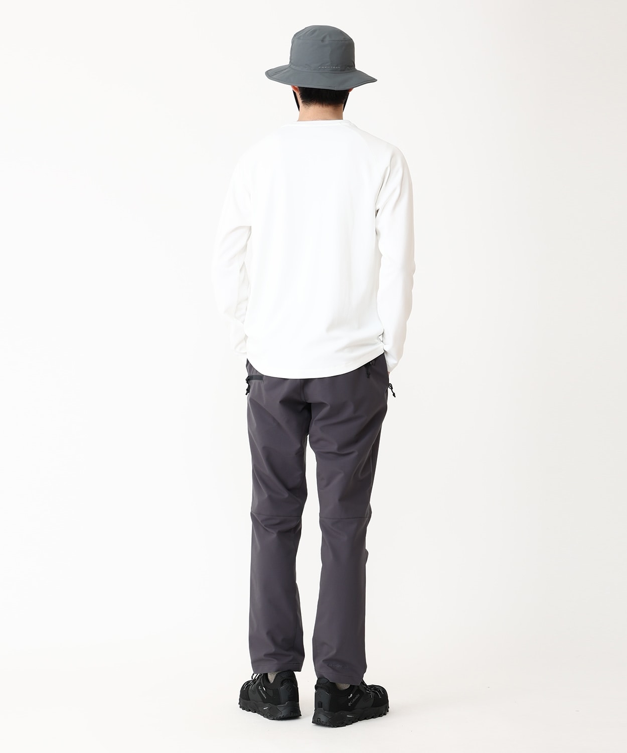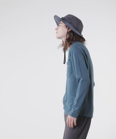 動きに追随する十分なストレッチ性を備え、体にラインを拾いすぎない程よく厚みのある生地感は透けにくく、スタイリッシュな着こなしを実現。独自の吸湿速乾機能とサンプロテクション機能に加えて、肩周りの可動域を広げるラグランスリーブや、左胸のポケットワークなど、ハイク仕様のディテールも充実しています。