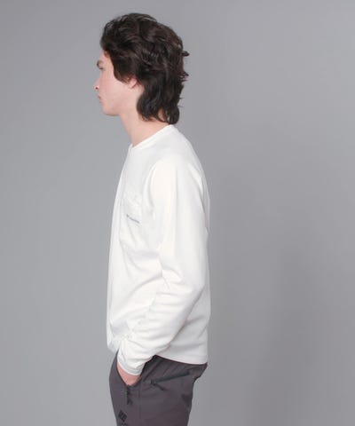動きに追随する十分なストレッチ性を備え、体にラインを拾いすぎない程よく厚みのある生地感は透けにくく、スタイリッシュな着こなしを実現。独自の吸湿速乾機能とサンプロテクション機能に加えて、肩周りの可動域を広げるラグランスリーブや、左胸のポケットワークなど、ハイク仕様のディテールも充実しています。
