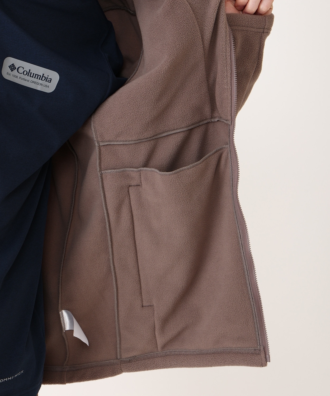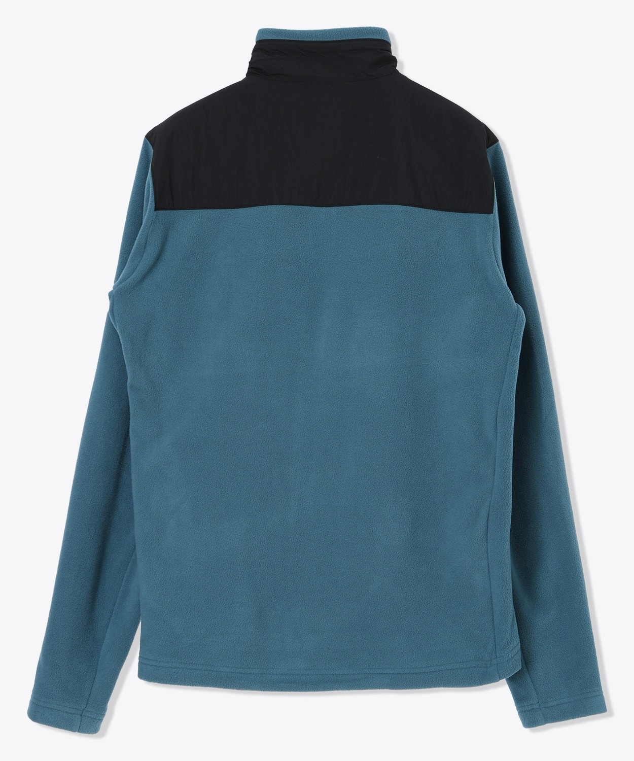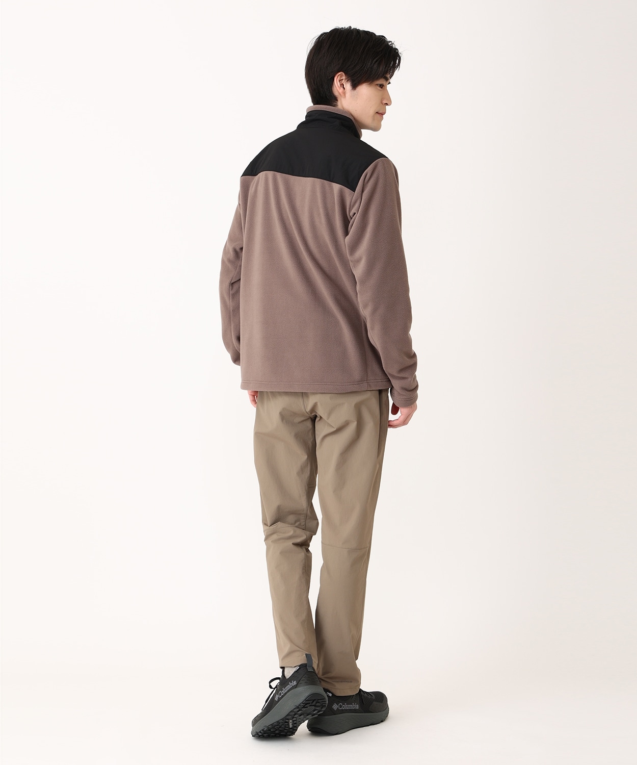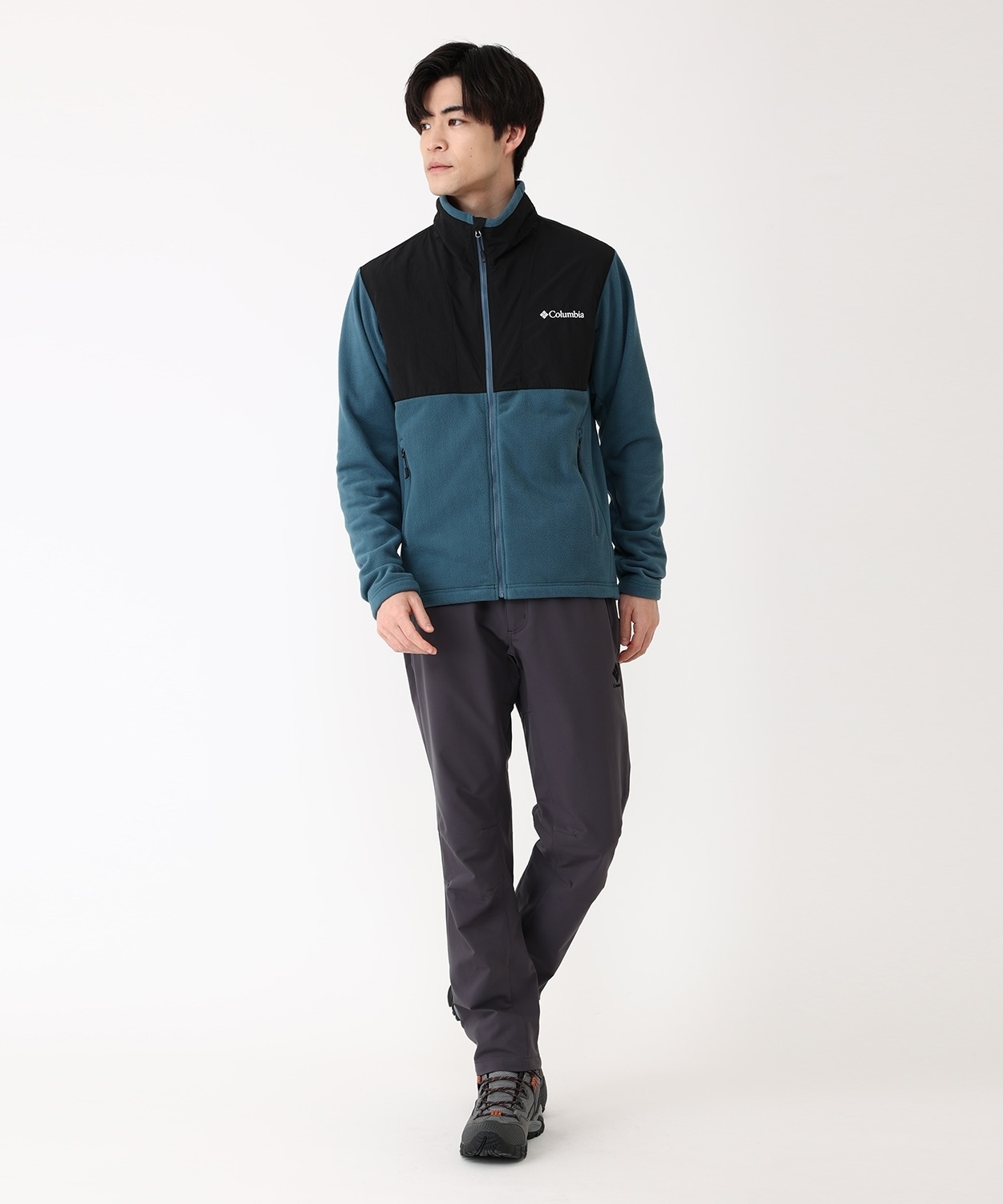 コロンビアの特徴的なディテールの1つである、立体的な前襟パターンのビブネックラインが着用時の快適性を高め、胸元から首元にかけては、はっ水(撥水)加工のウーブン素材をオーバーレイすることで、ザック使用時の耐久性にも考慮。レイヤリングしやすいフィット感で、ロングシーズンに対応できる一着です。