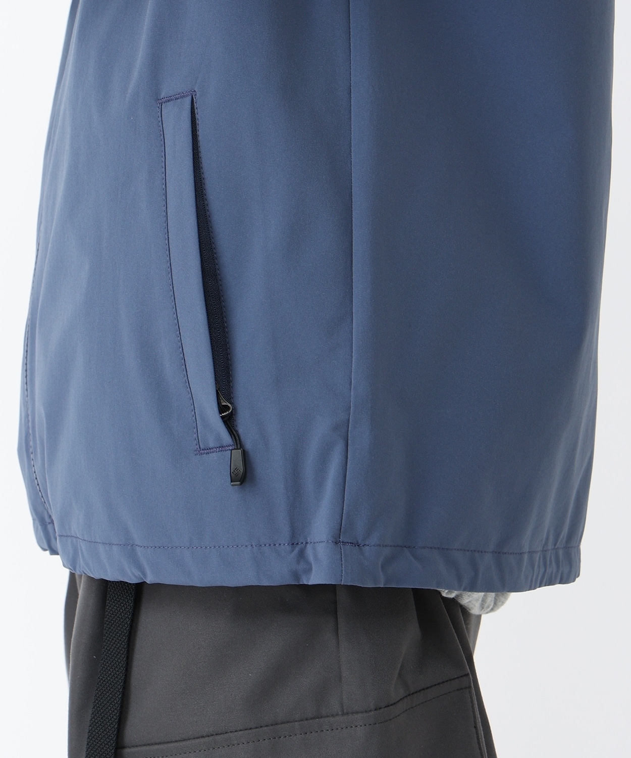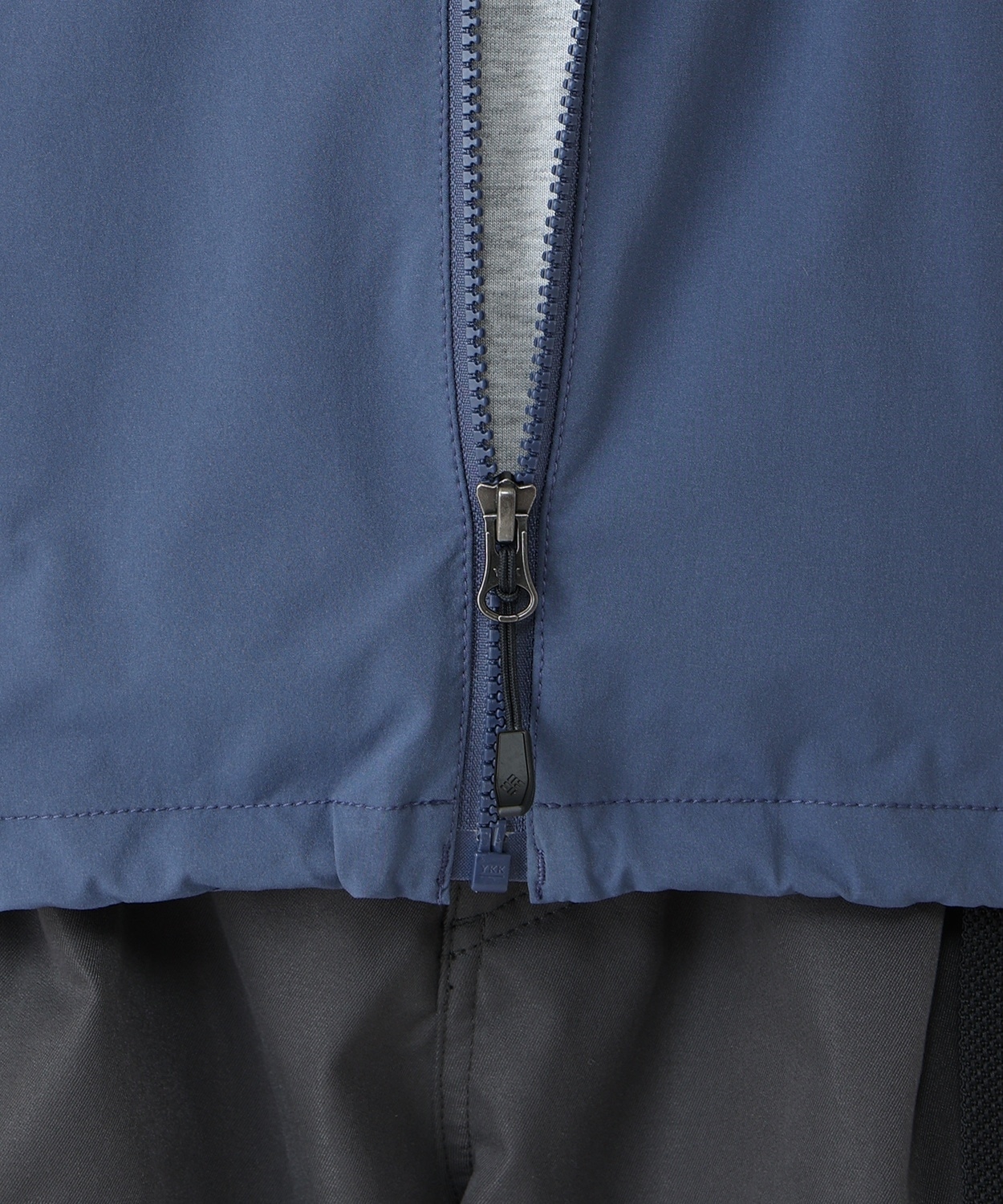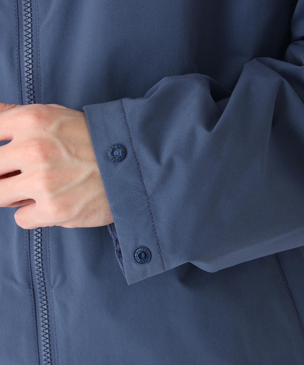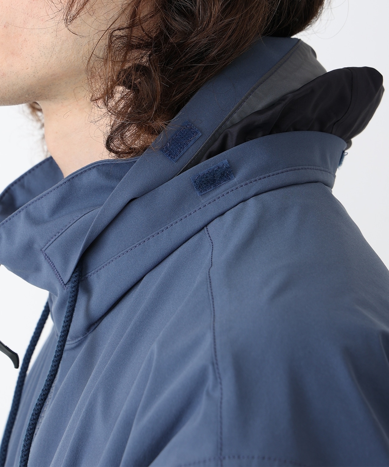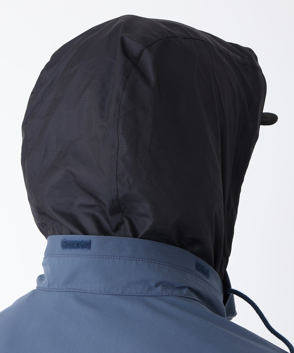 襟元のスタンドカラーがスタイリッシュな雰囲気を醸し出し、急な雨などに対応したエマージェンシー用途のフードは、襟の内側に折りたたんで収納することができます。また、裾はドローコード仕様を用いることで、コーディネートや天候に応じてシルエットチェンジも楽しむことができます。