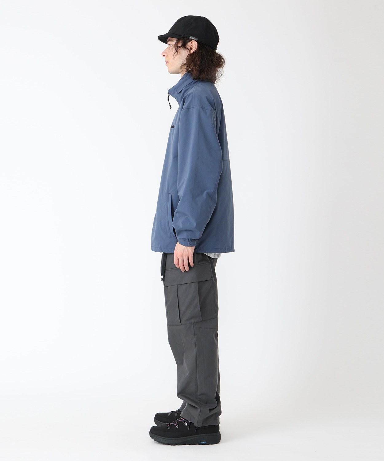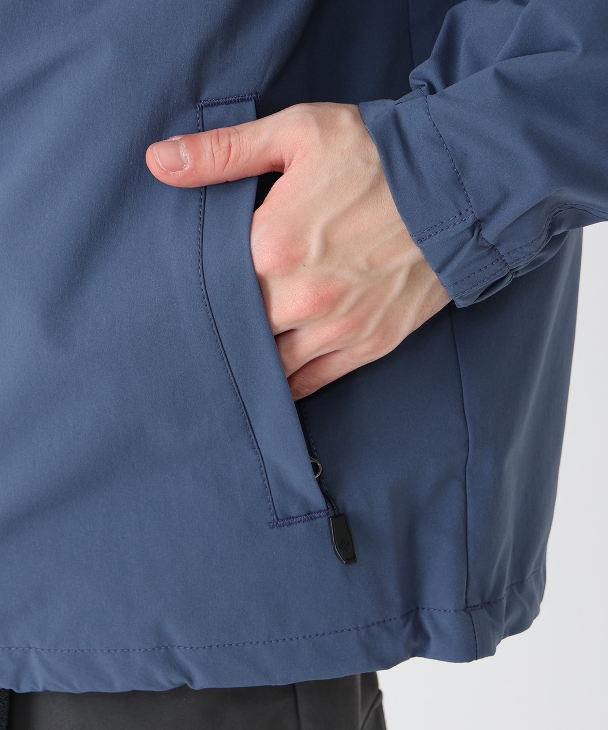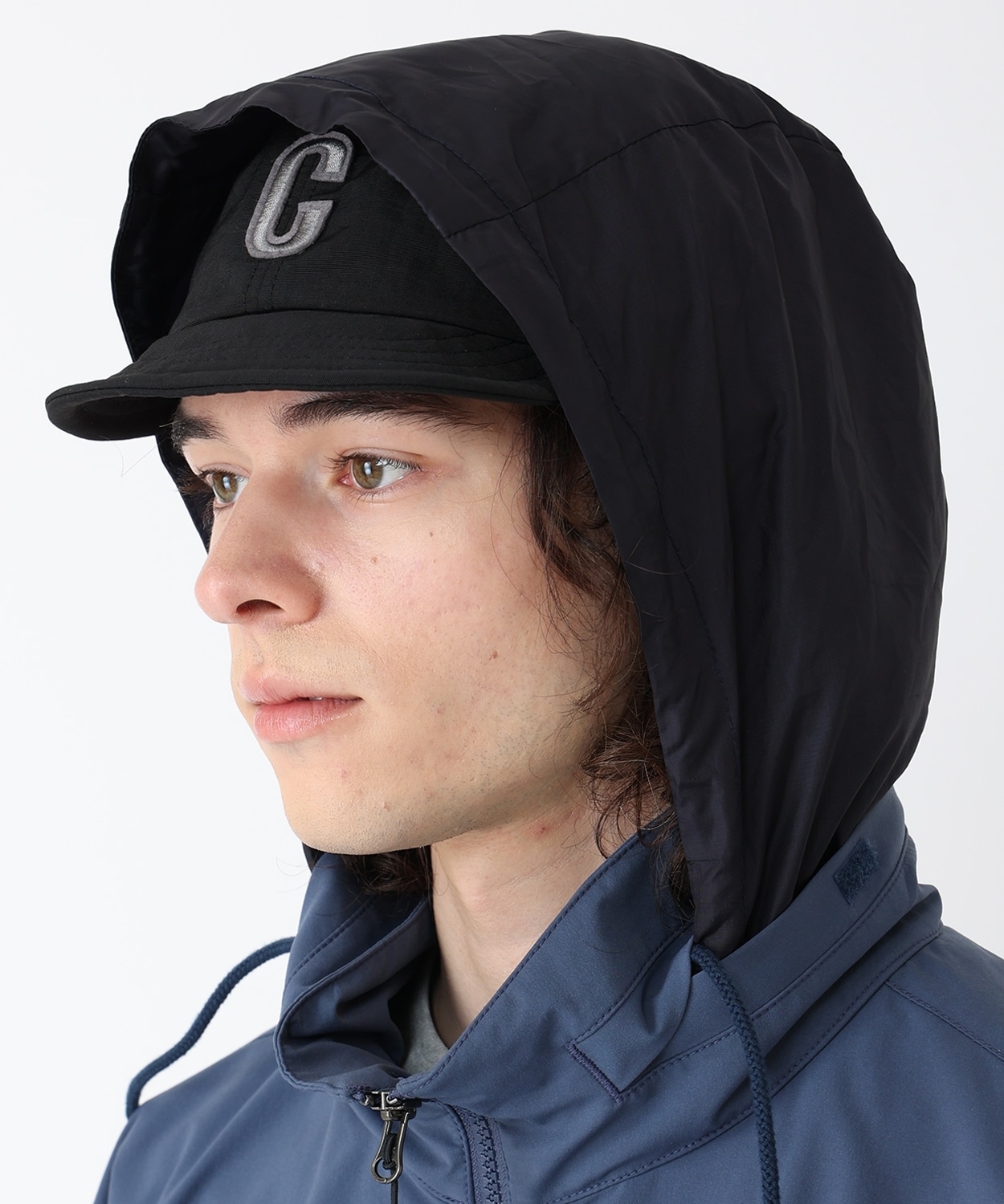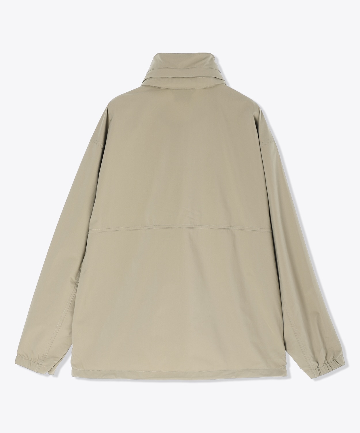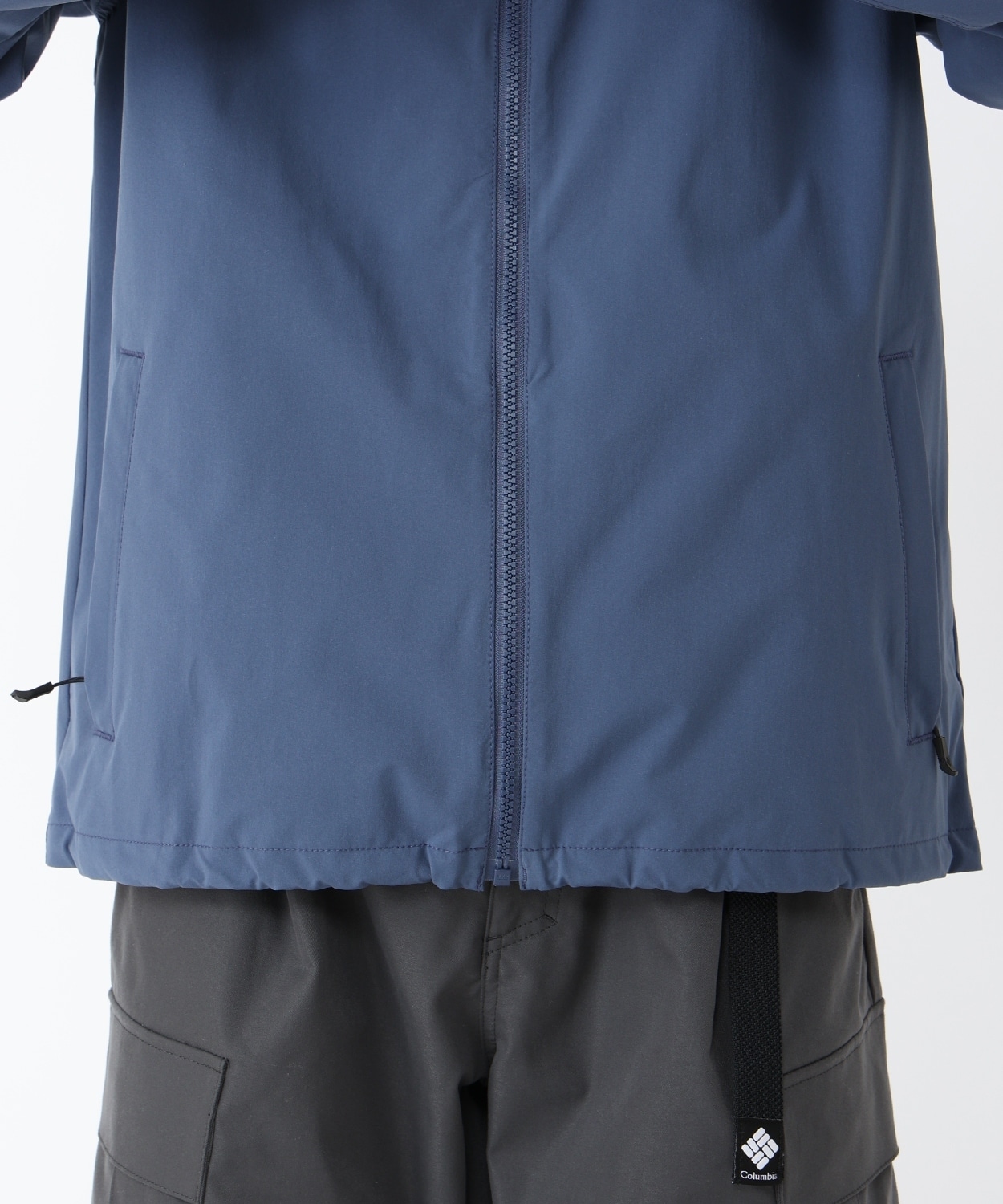 襟元のスタンドカラーがスタイリッシュな雰囲気を醸し出し、急な雨などに対応したエマージェンシー用途のフードは、襟の内側に折りたたんで収納することができます。また、裾はドローコード仕様を用いることで、コーディネートや天候に応じてシルエットチェンジも楽しむことができます。