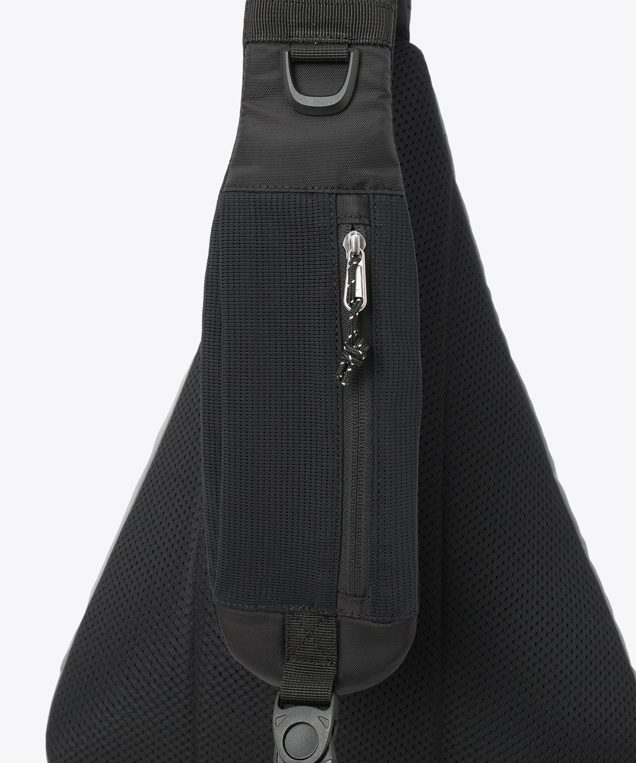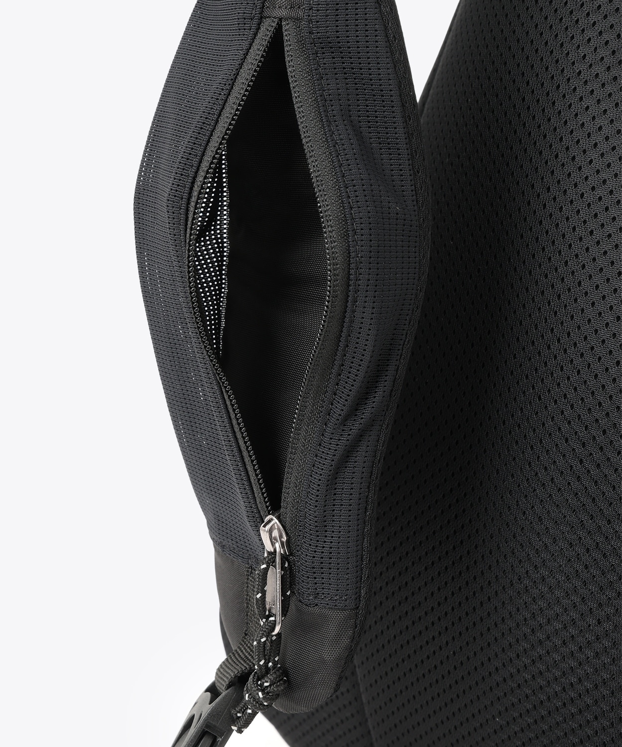 ・ショルダーハーネス:スマホが収納できるサイズ感のストレッチメッシュ素材のファスナーポケット
