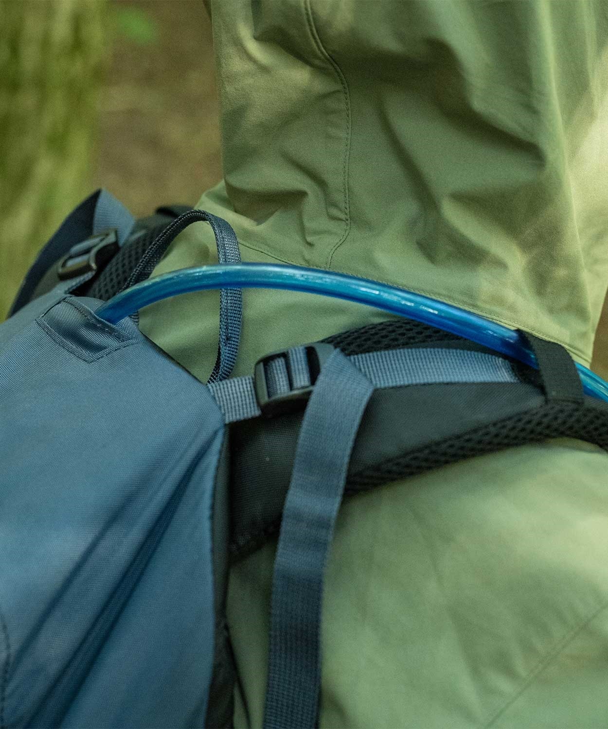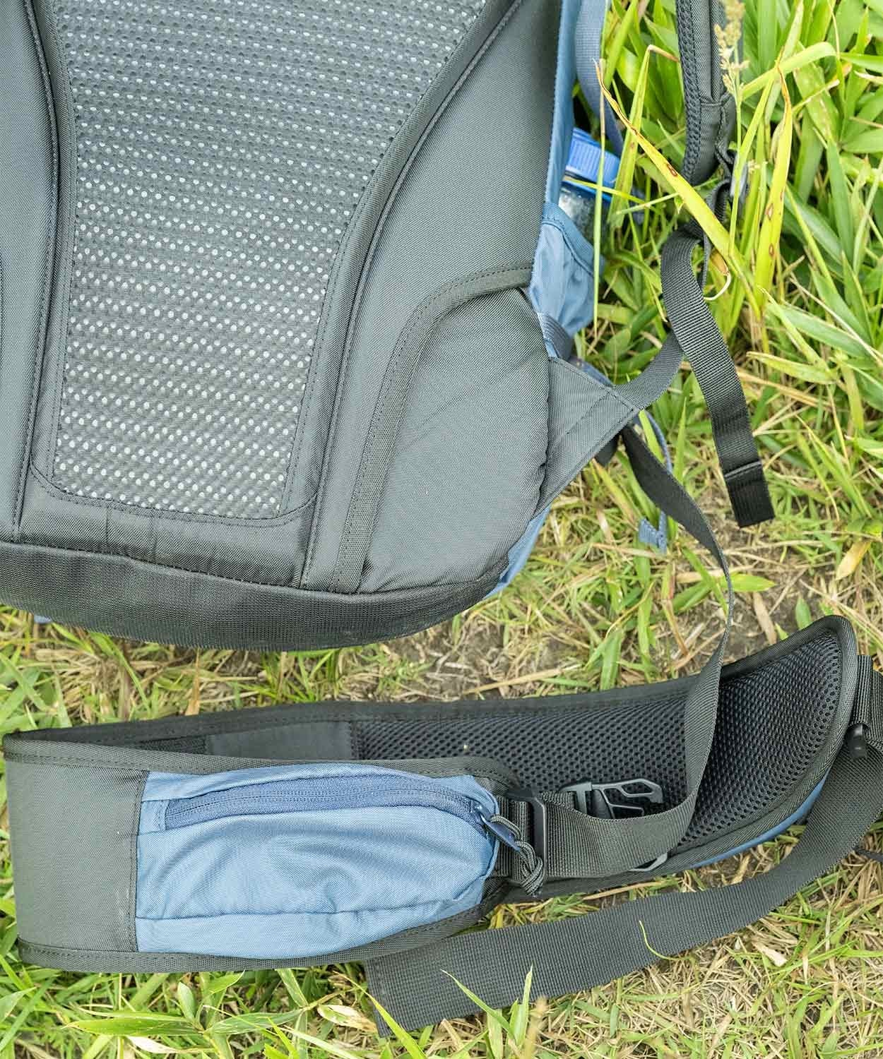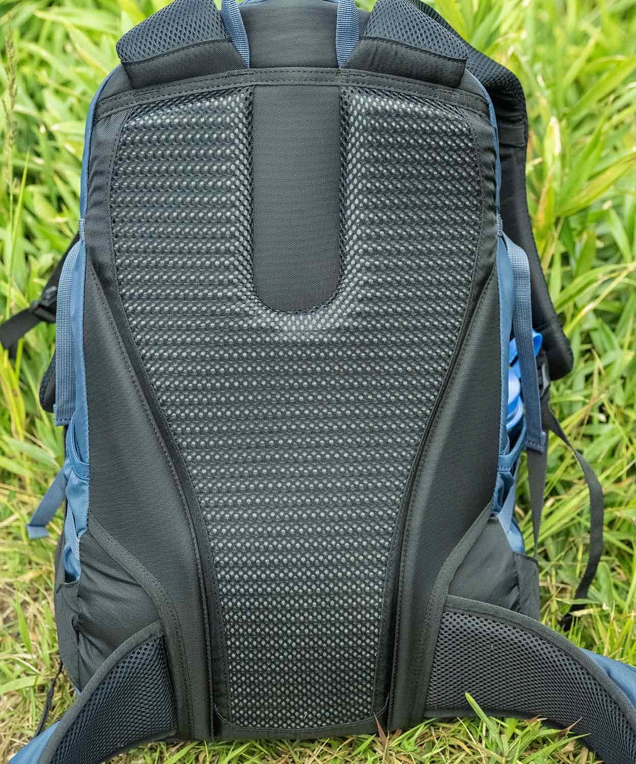 ・背面内部に肩の荷重を腰に伝え背中全体に分散させる軽量アルミサポートフレーム