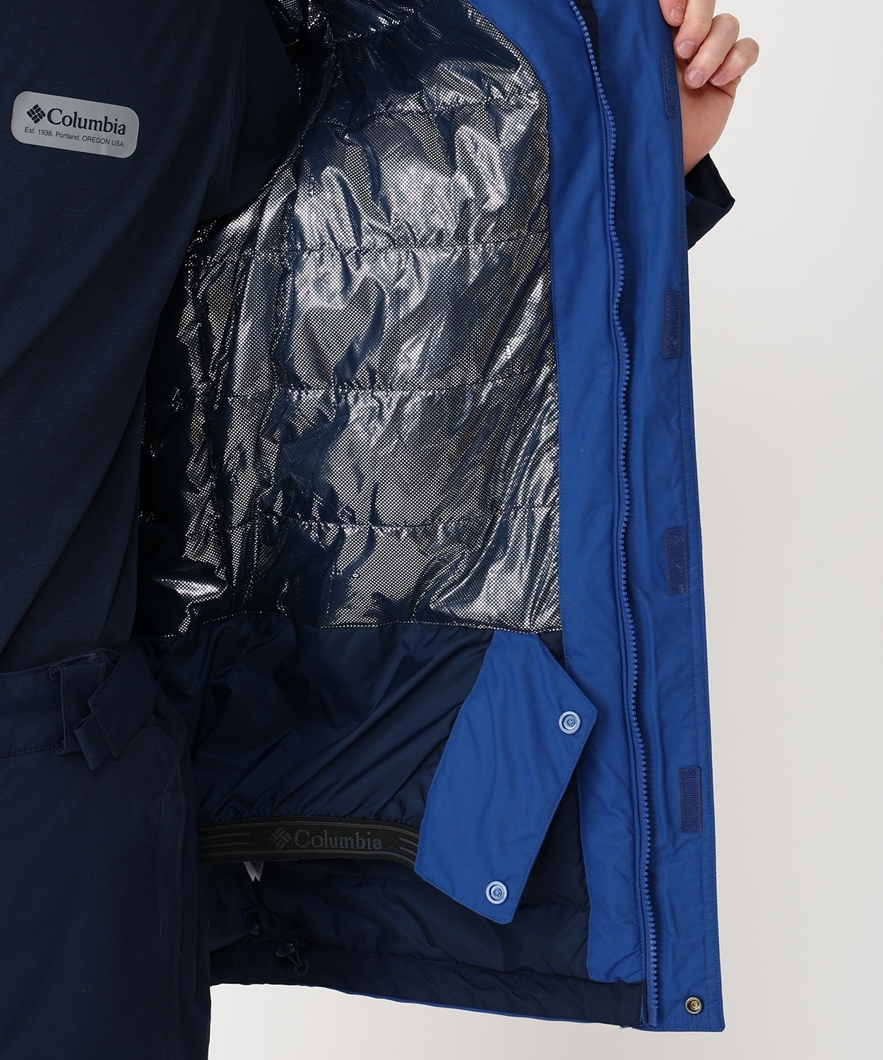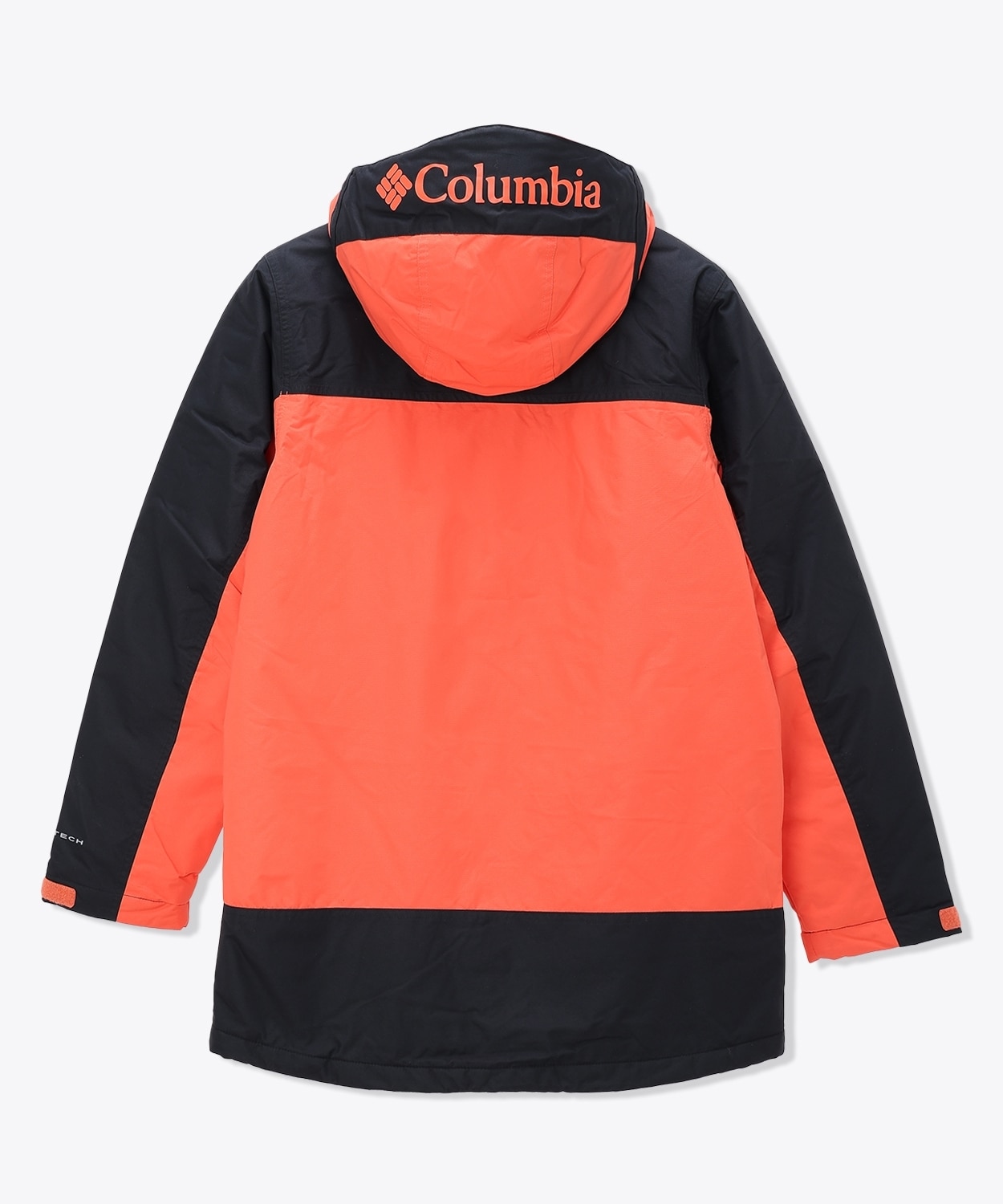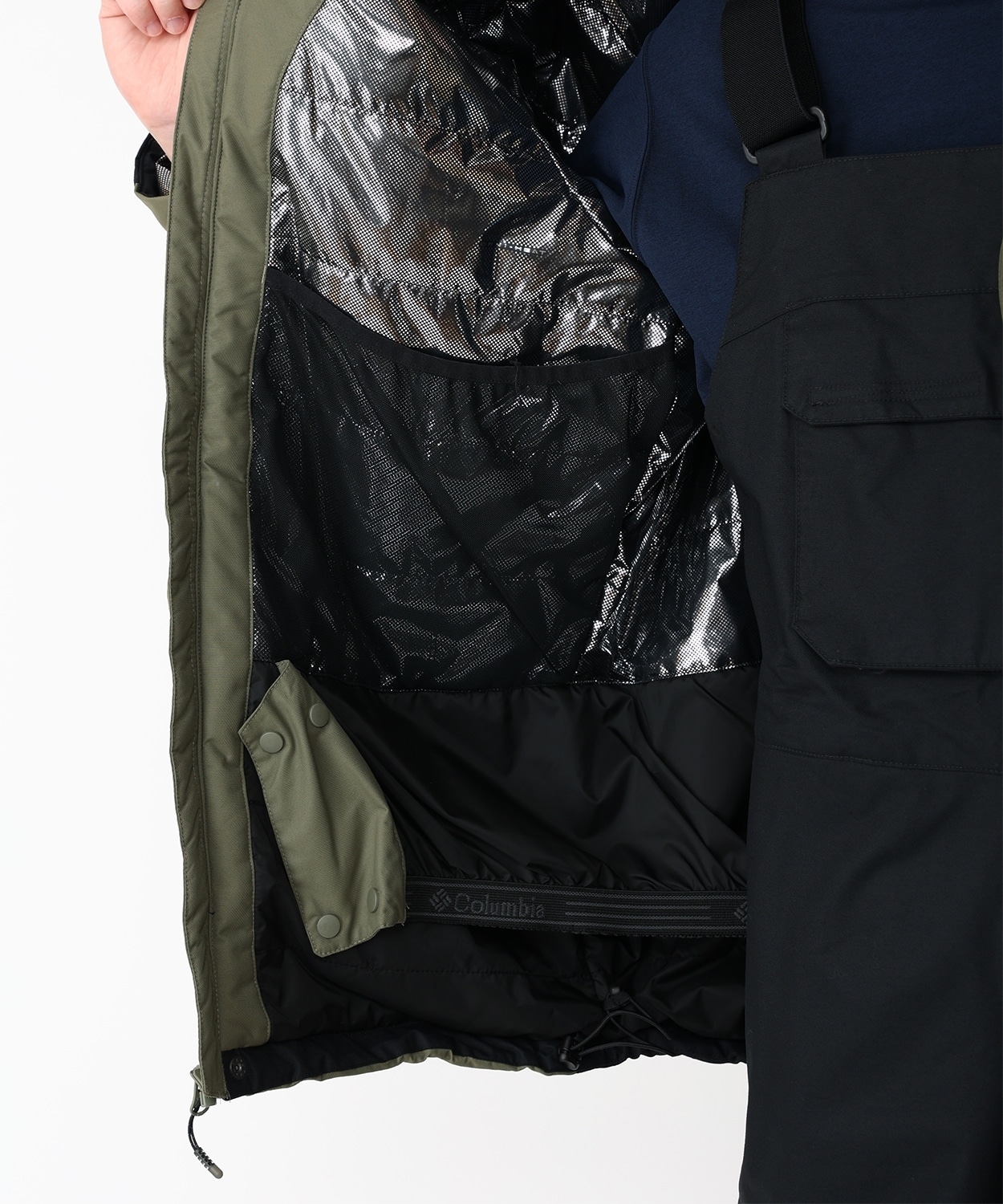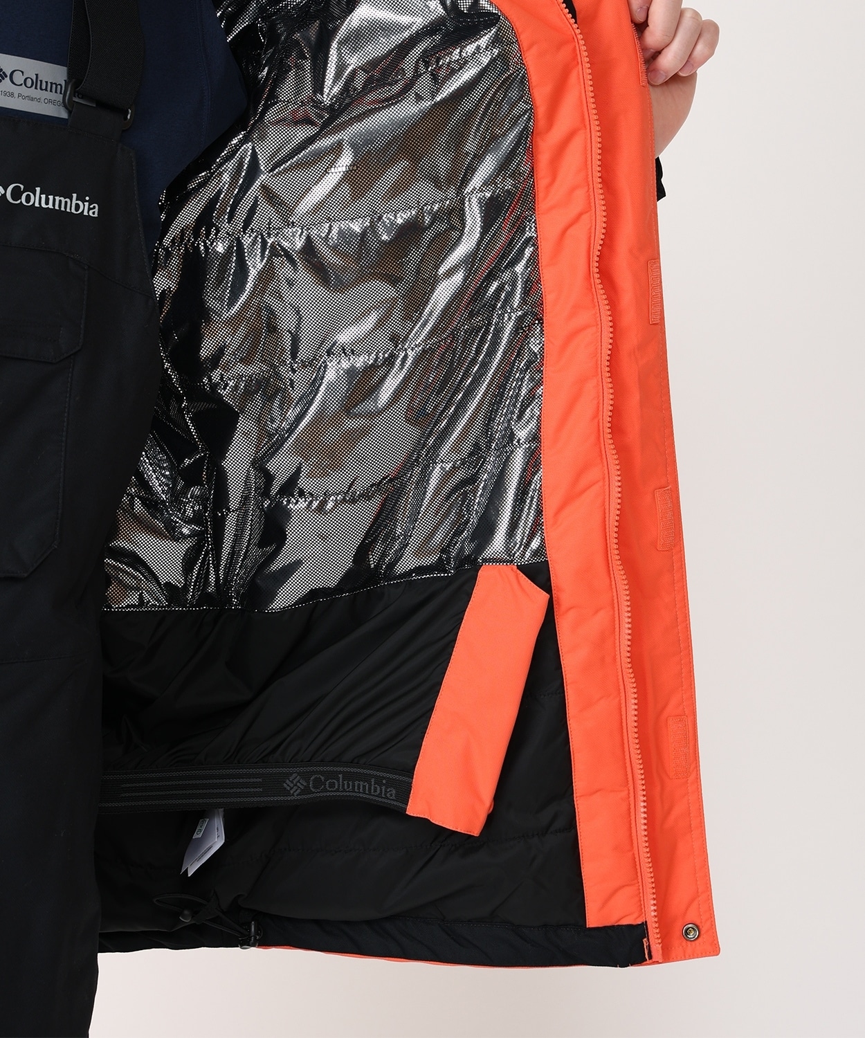 雨に強くムレにくい独自の防水透湿機能を備え、裏地に熱反射保温機能が体の熱を反射し暖かさをキープ。ヘルメットに対応するフードデザインや、ゲレンデに必須なポケットワーク、冷気を防ぐ前立仕様やチンガードを装備するなど、ウィンタースポーツに適したディテールも充実。フードを被るとブランドロゴがアクセントとなり、コロンビアらしさを込めたアイテムです。