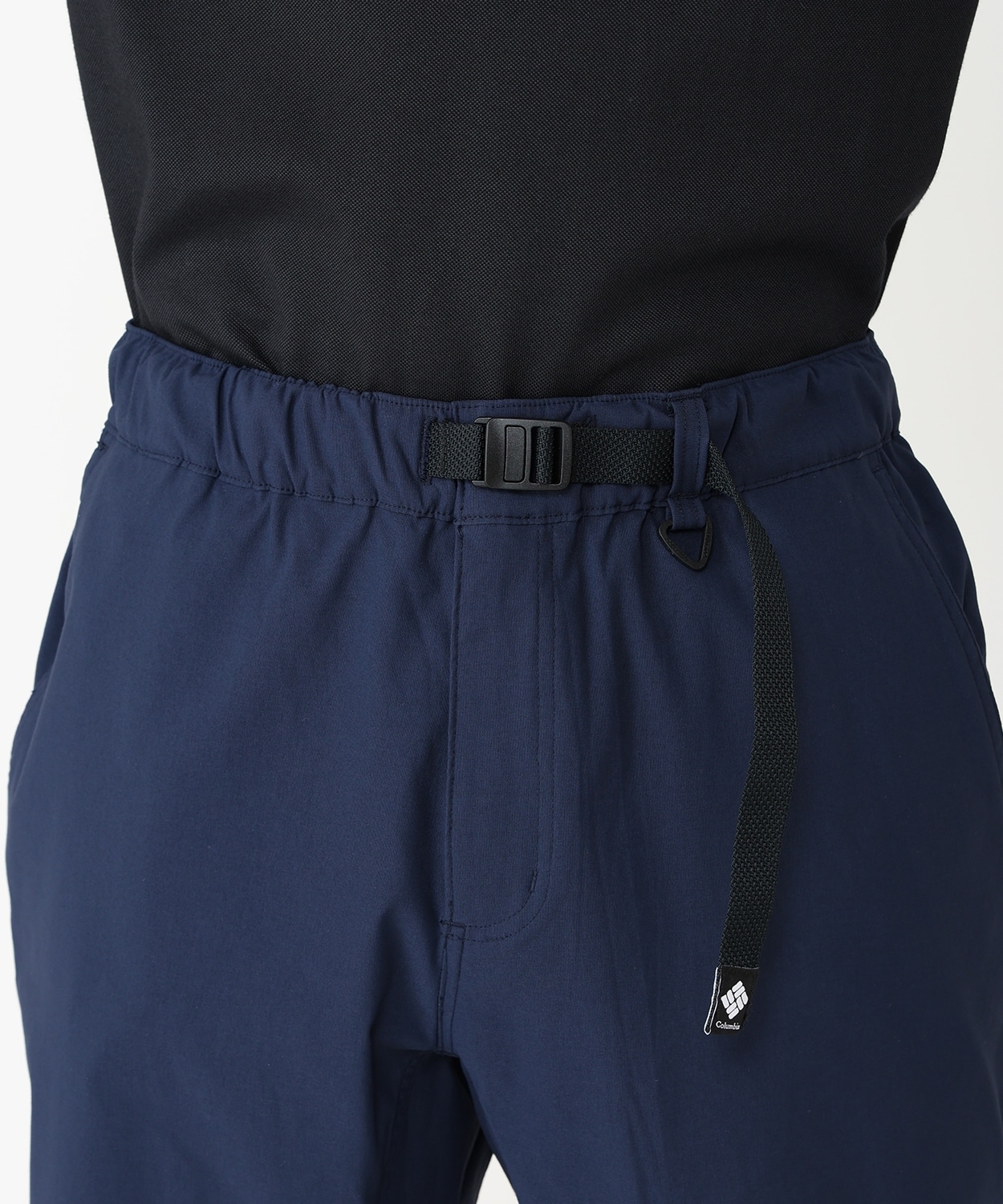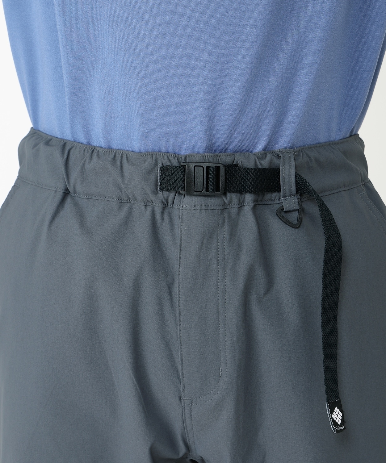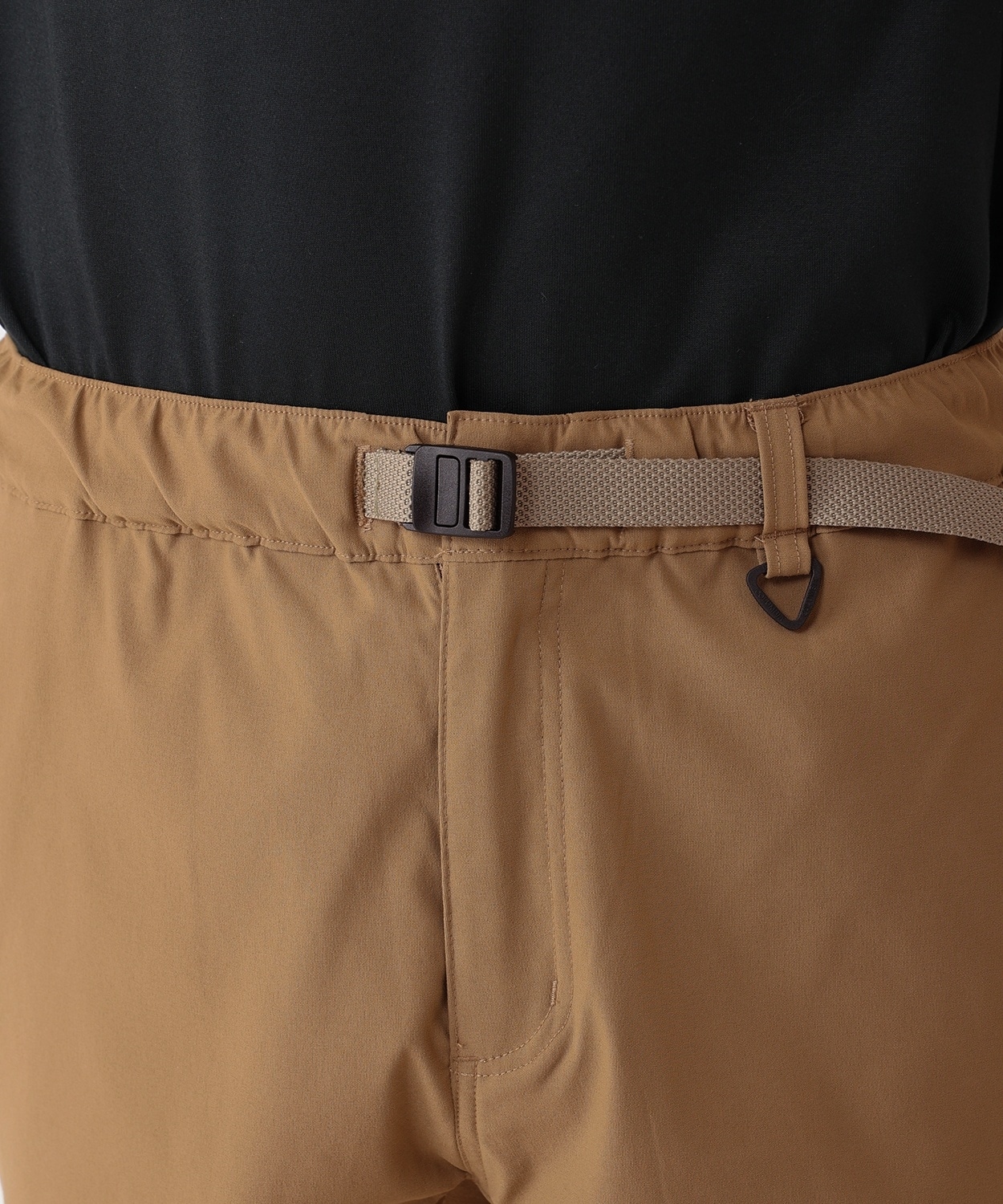 ウエストは、片手で調整できるナイロンベルトを用いており、カジュアルなアクセントをプラス。両サイドにはスラッシュポケット、ヒップには簡易的に閉じることができるスナップボタン仕様のポケットを配置しました。