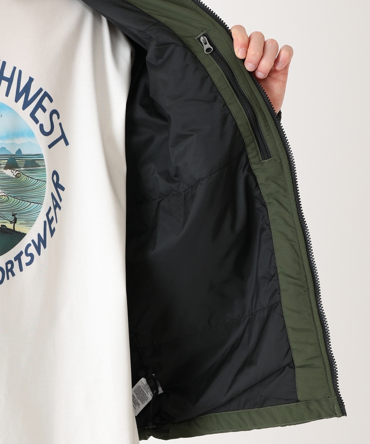 アウトドアシーンから日常まで幅広く活躍する、リサイクルポリエステル素材の薄中綿を封入したジャケット。
