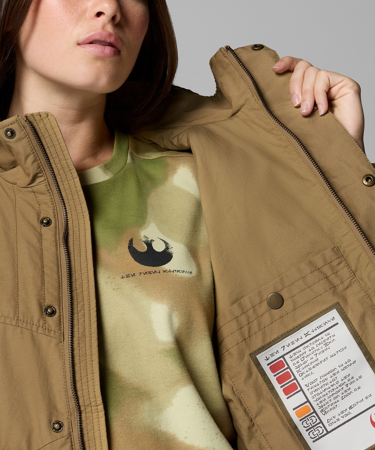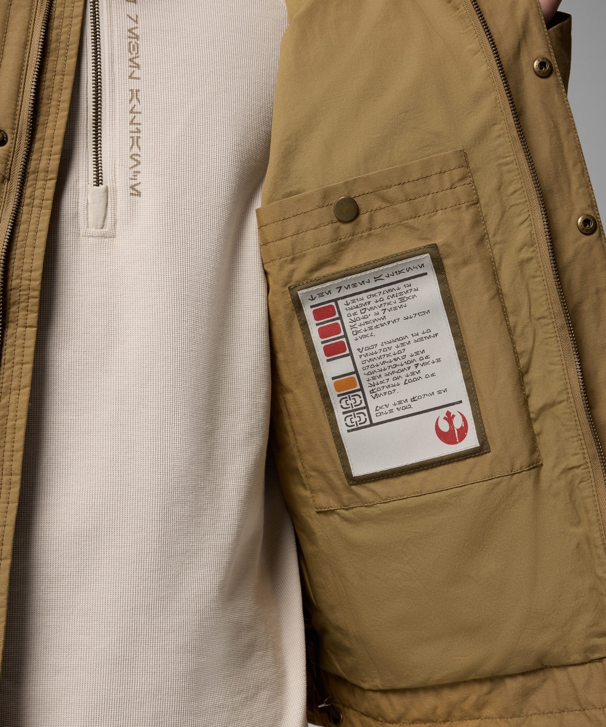 反乱軍の同士たちへ。このカーゴジャケットは、「エンドア」の戦いでの反乱軍に着想を得たもので、アウトドア愛好家とスター・ウォーズ ファンたちの心をつかむディテールと共に進化した利便性を提供する着回し自在な重ね着アイテムです。