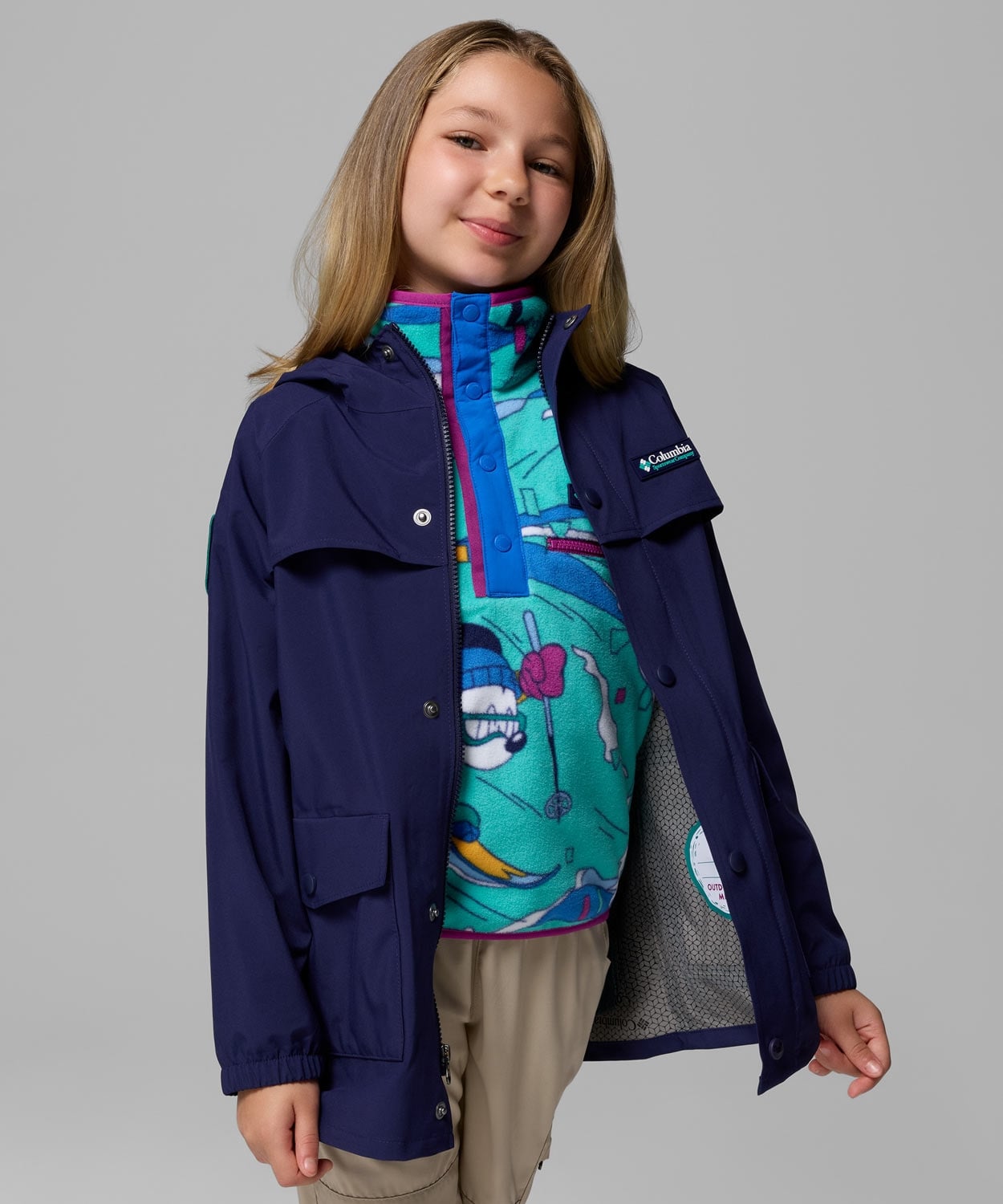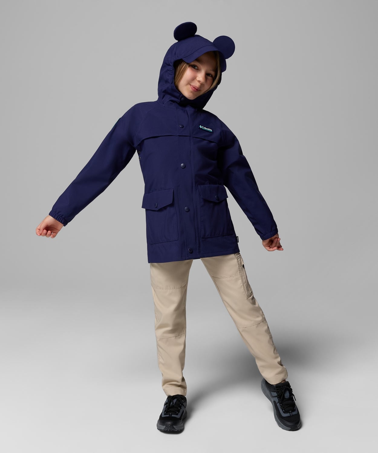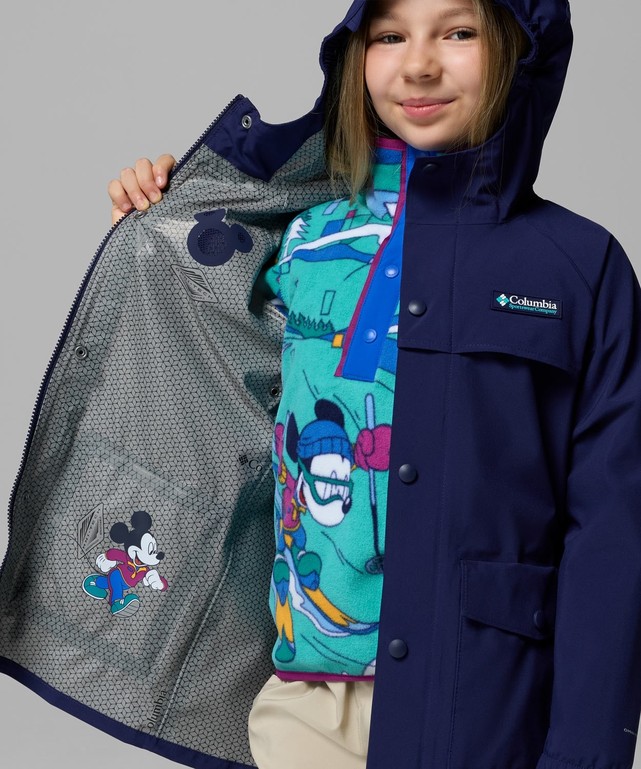 雨の日をもっと楽しく。防水透湿テクノロジーとフルシームシールでしっかり防水する特別仕様のシェルジャケット。収納可能なミッキーの耳や、ミッキー型のベンチレーション、Mickey’s Outdoor Club デザインのパッチなど、遊び心あふれるディテールが満載です。