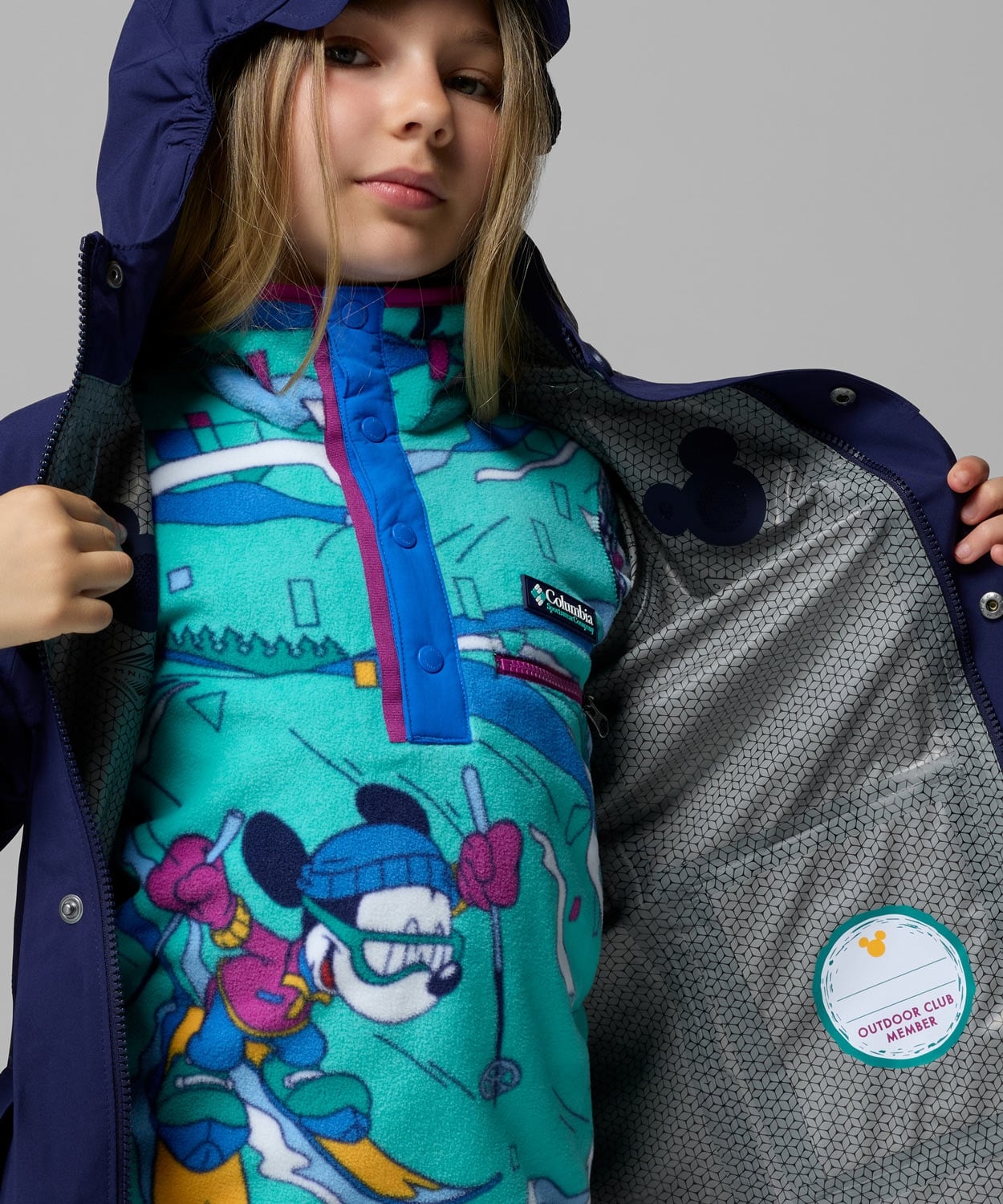 ・ジャケット内側にミッキーデザインのプリントと、名前を書き込める「Outdoor Club Member」プリント