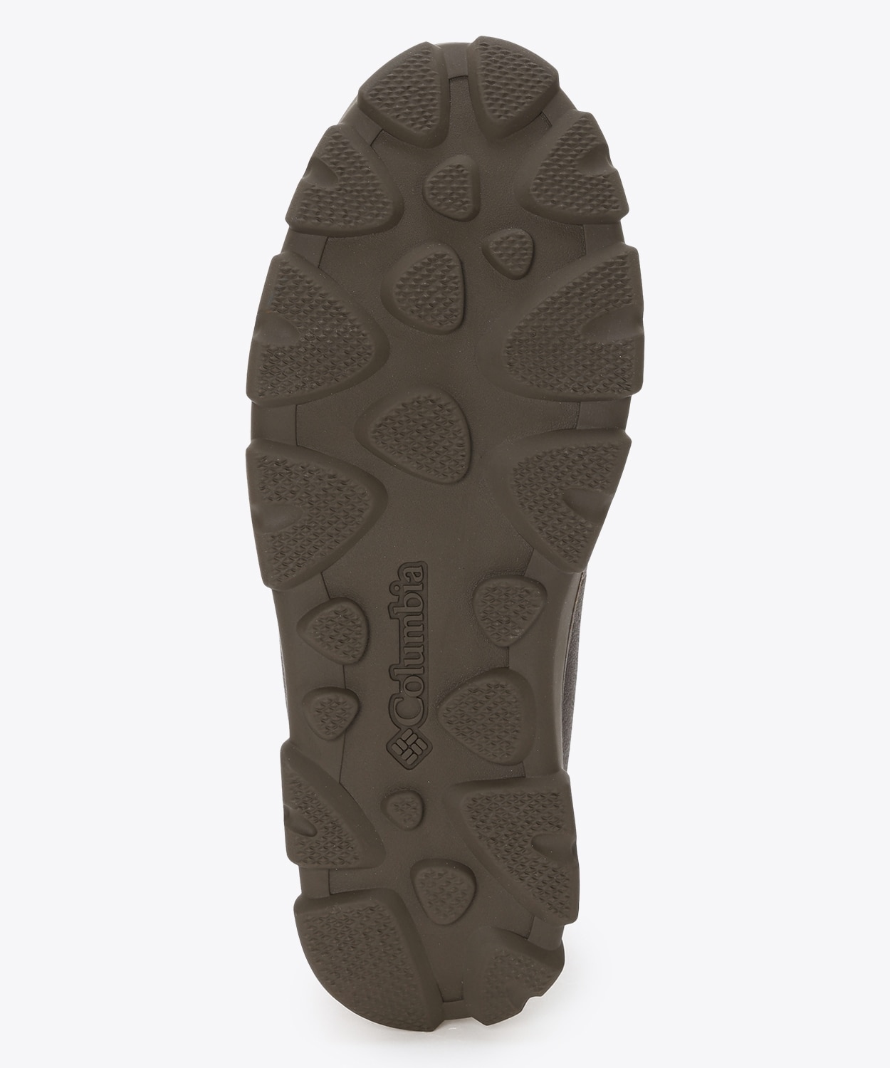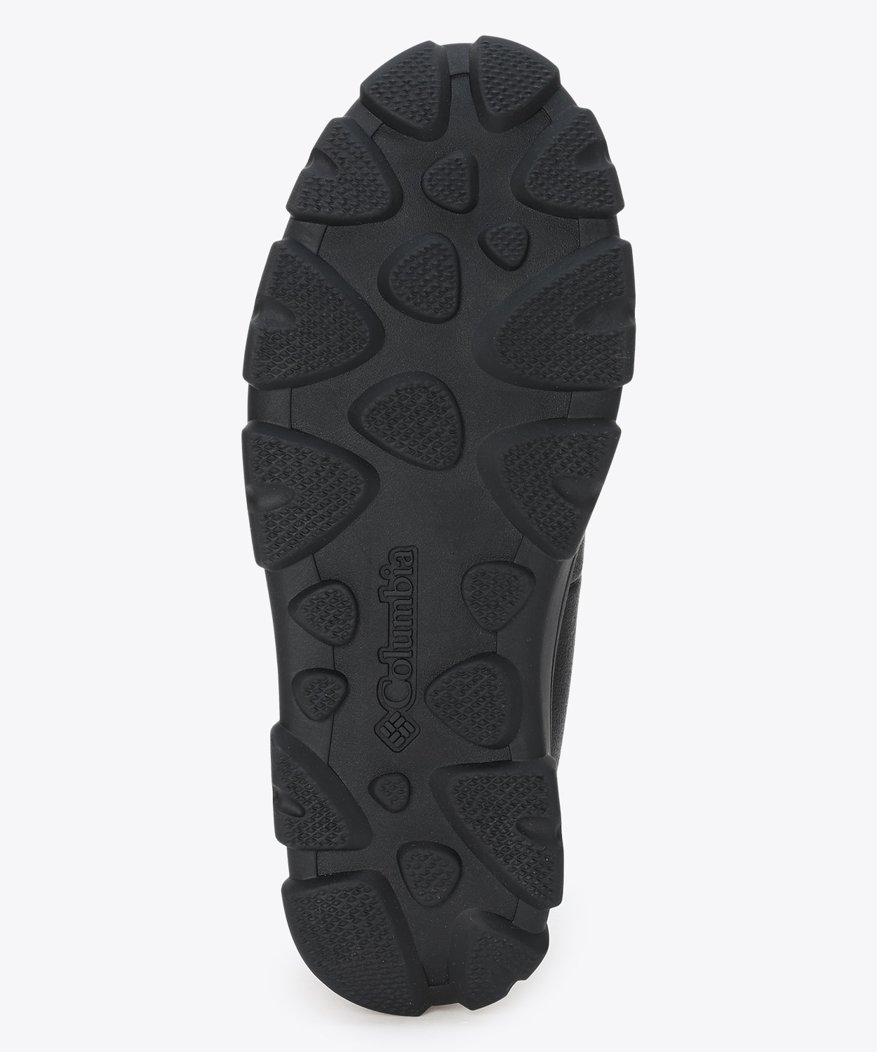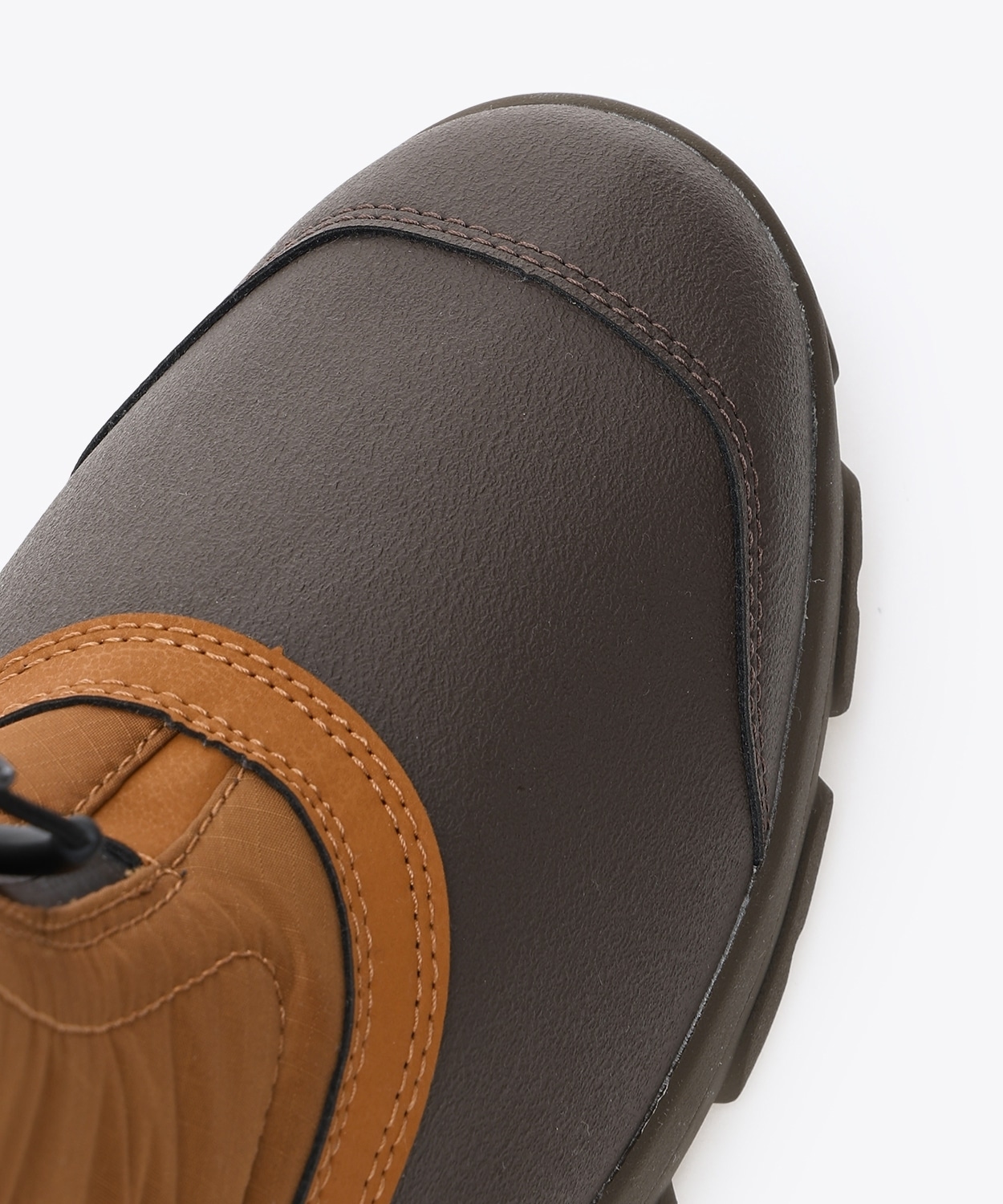 強靭さを持つナイロンリップストップ素材のアッパーは、防水メンブレンを備え、PUシェルを組み合わせることで、高い防水性を誇るとともに、軽量化と歩行のしやすさを確保。フロント部分には、ガバっと大きく開く止水ファスナーを設け、脱ぎ履きも簡単。さらに、岩場の石をラグに見立て、不均一なサイズと形状にて配置したアウトソールが、雪の上や凍結路面でもしっかりとグリップ力を発揮します。