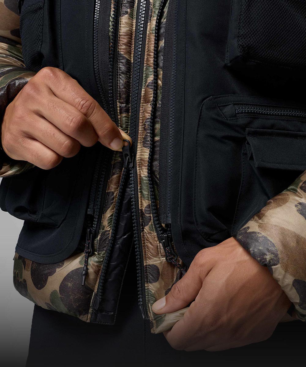 クラシックなハンティングギアから着想を得た、限定仕様のベスト×ジャケットのコンビネーションモデル。革新的な「Interchange™システム」を反転させ、アウターベストとインナージャケットを単体でも重ね着でも着用できる、汎用性の高い3-in-1仕様です。
