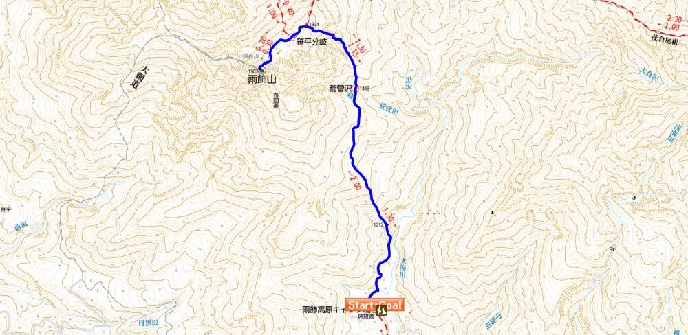 | 14:00 | 登山口到着。雨飾荘に戻ります。 |