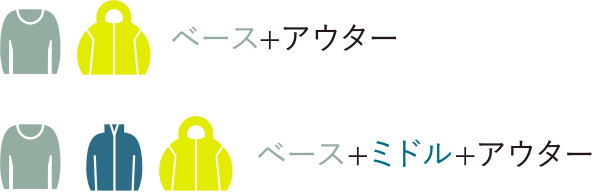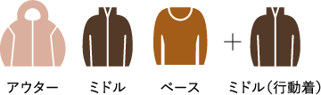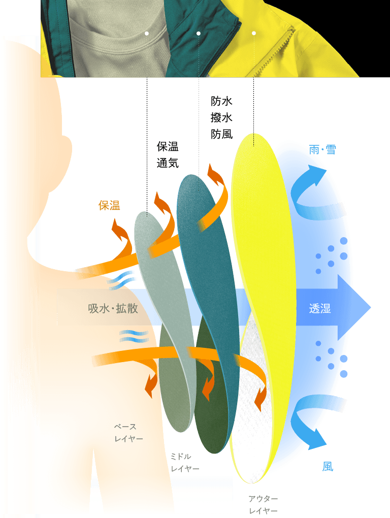 保温性と通気性のバランスを調整するレイヤー。大きく行動着と保温着に分けられ、気温などの環境や体調に応じて様々な機能のミドルレイヤーを選択します。主にベースレイヤーから汗などの水分を受け取り、さらに外に移動させる吸水性と速乾性も兼ね備えています。