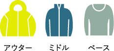 肌に直接触れるウェアで、素早く汗を吸水してミドルレイヤーに移し、肌面を常にドライに保つのが大きな役割です。肌面をドライに保つことで気化熱による汗冷えを抑えます。保温性も兼ね備え、身体にフィットするタイプが主流です。ファーストレイヤーとも呼ばれます。