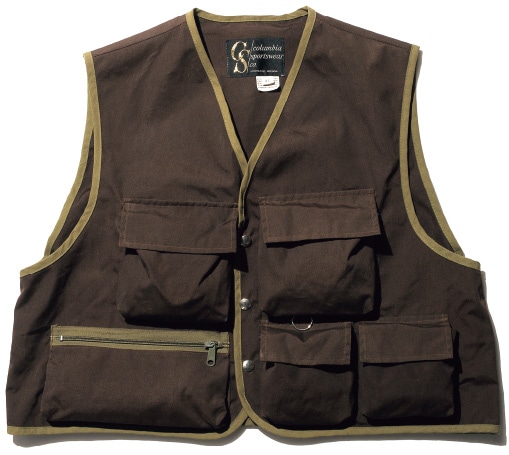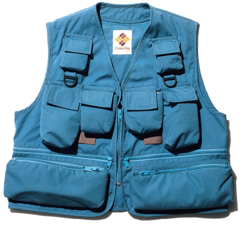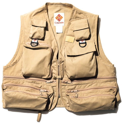 コロンビアを代表する名品といえば、マルチポケットフィッシングベスト。1960年にガート・ボイルが、夫と友人のために作った一着が製品化され、時を超えて多くの人々に愛されるロングセラーとなった。70年代後半に作られた本モデルを見ると、水に濡れないように短めに設定された着丈、胸元の複数のフラップポケット、下方に二重に配されたジップポケット、そしてロッドを固定するループといった特徴的なディテールが、すでに採用されていることがわかる。徹底してユーザー目線に立ち、アウトドアでリアルに機能するギアとしての服作りを続けてきたコロンビアの姿勢を深く理解できる逸品だ。