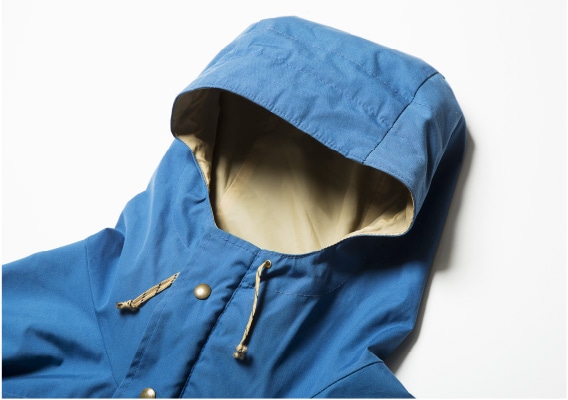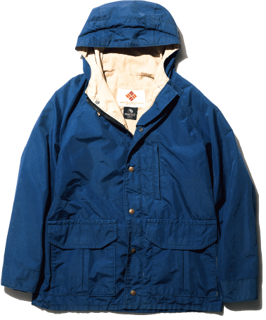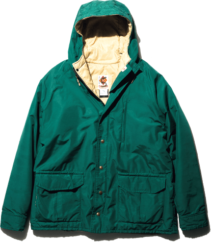 マウンテンパーカというウェアが初めて登場してから間もない70年代後半に作られた一着。大きなフラップポケットやフードといった、定番のディテールがすでに備わっている。その一方、身頃から袖にかけて縫製がなく、一体となった作りやゆったりとしたシルエットが初期モデルらしい素朴さを漂わせる。この当時からフロントはスナップボタンとダブルジップで閉める仕様となっており、胸元にはプリーツ付きのポケット、下方にはサイドから手を差し込める二重ポケットを備えるなど、機能性を追求する姿勢がうかがえる。その後アウトドアウェアの定番アイテムとして親しまれるマウンテンパーカの原型になっている。