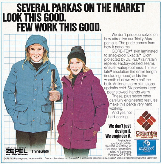 80年代、コロンビアの躍進を支えたのが、1986年に発売されたバガブーパーカだ。アウトドアの基本的な着こなしであるレイヤリングを一着のウェアで実現するという発想から生まれたインターチェンジシステム。それを初めて採用したウェアであるバガブーパーカは、100万枚以上を売り上げる大ヒットとなった。ナイロン製のアウターとフリースのインナーは、ジッパーで簡単に着脱できるようになっており、それぞれ単体でも着用可能。別売りのダウン入りのインナーに付け替えることもできた。また、ポップなカラーリングや大胆な配色の切り替えは、街着としても映えたため、アウトドアウェアをタウンウェアとして取り入れる先駆けとなった。