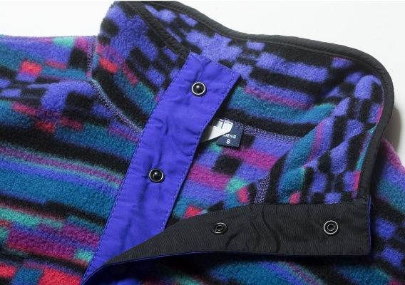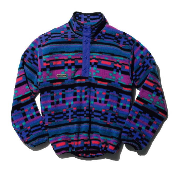 すでにアウトドアウェアがファッションアイテムとして認められるようになっていた80年代後半から90年代にリリースされたのが、このフリース素材のプルオーバーだ。フリースといえば、いまや定番中の定番だが、コロンビアはそれをいち早く導入し、大ヒットを飛ばした。耐久性に優れ、雨にも強く、汚れても洗えるフリースは、誰もが待ち望んだ夢の素材だったに違いない。この一着はプルオーバータイプでポケットもないことから、インナーとして着用することが前提だったと思われる。また、当時を彷彿とさせるコンピュータのドット絵のようなカラフルで個性的な柄からは、ファッション性を強く意識していたことも読み取れる。